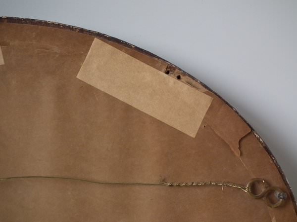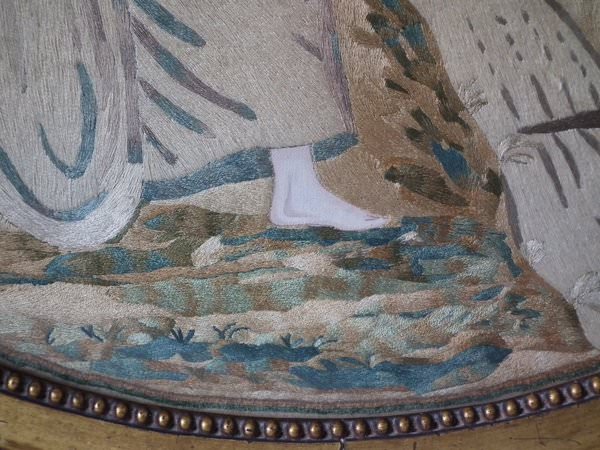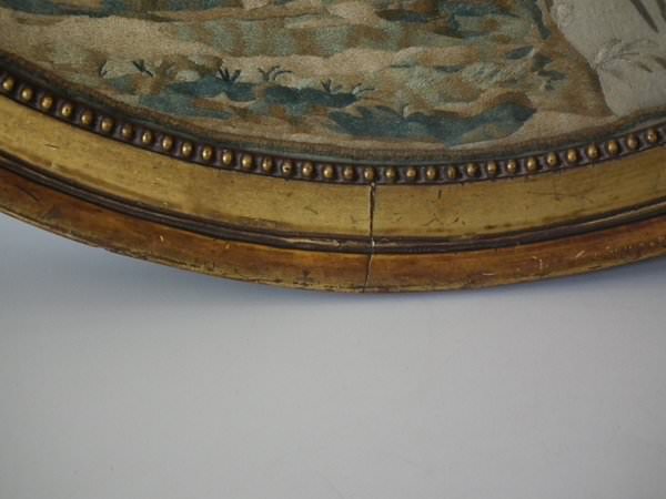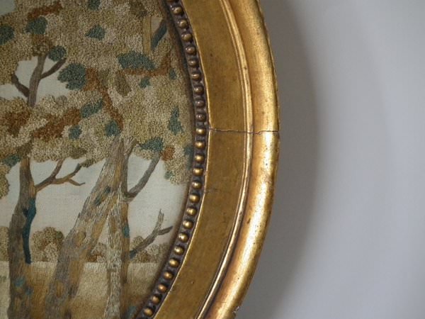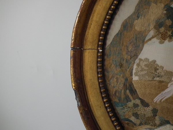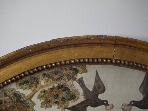 No stitch losses. Colours are mostly good and strong. No colour run. Neatly and evenly stretched. Frame showing some wear. Splits to the front. Some chips to the plaster coating. But is structurally stable and in our opinion could be hung 'as is'.