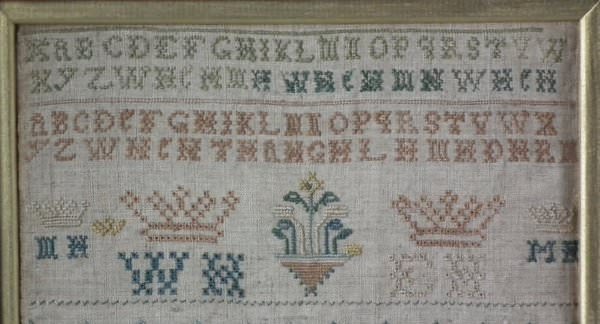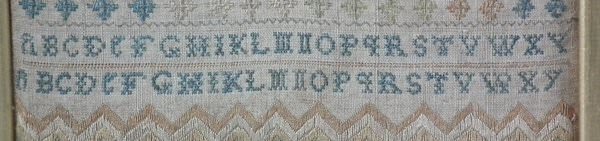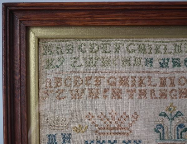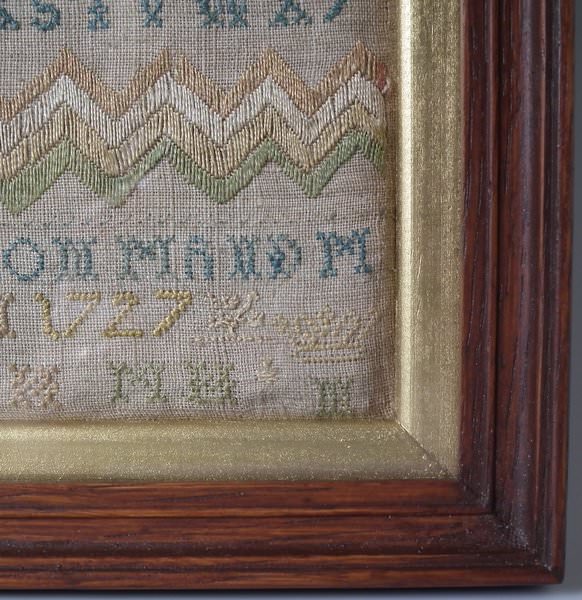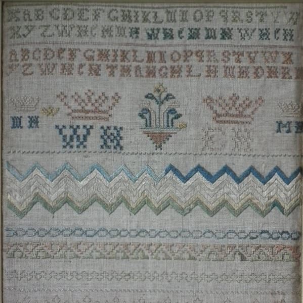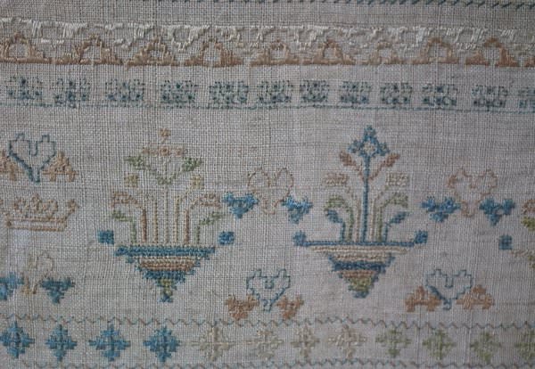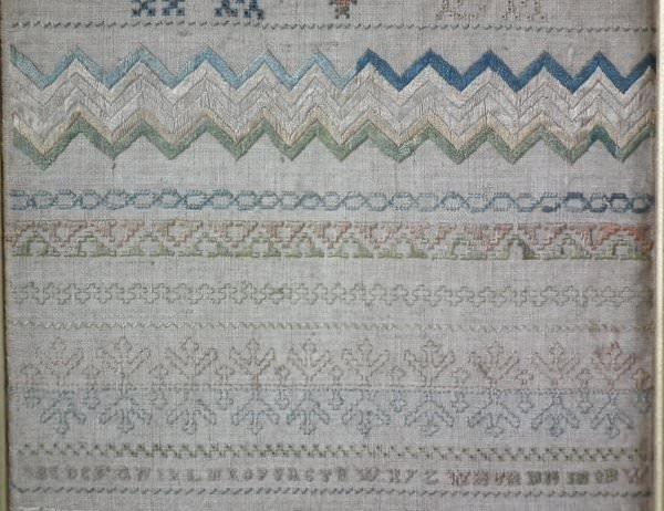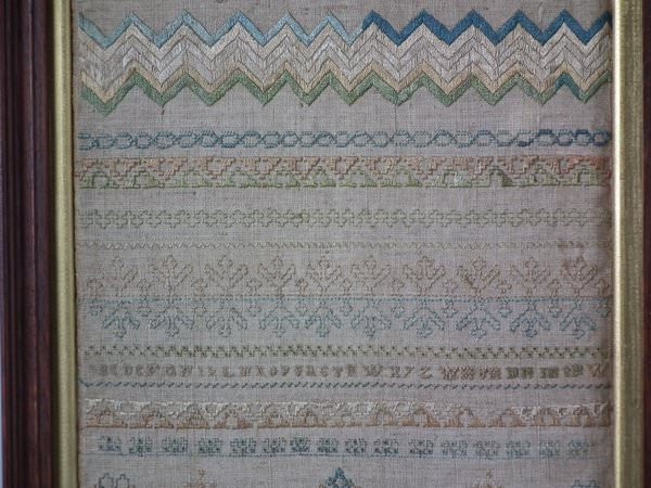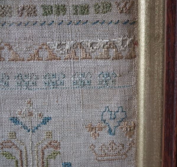 The sampler is worked in silk on linen ground, in a variety of stitches.
