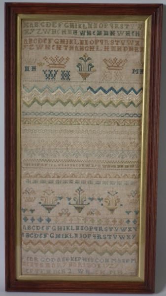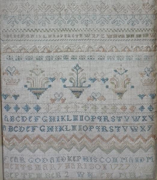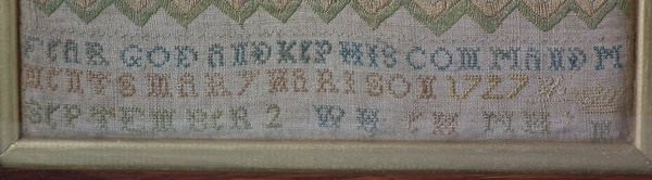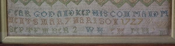 George II, dated 1727. 18ins by 8.25ins wide. Antique Sampler, 1727 Band Sampler by Mary Harison. Framed in an old wood frame with glass.