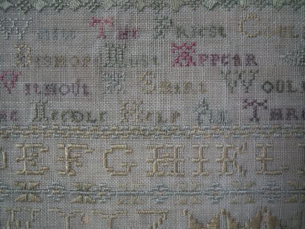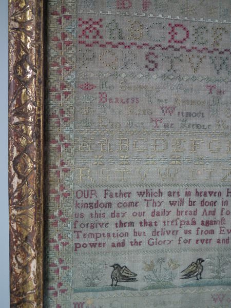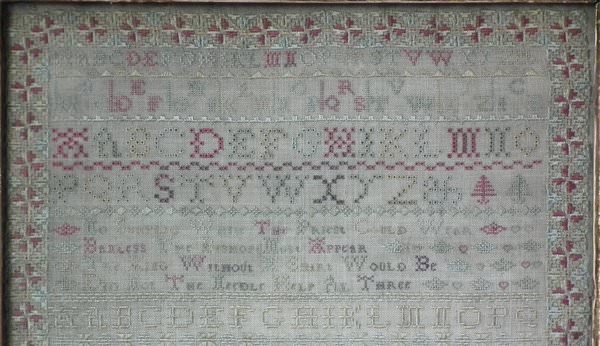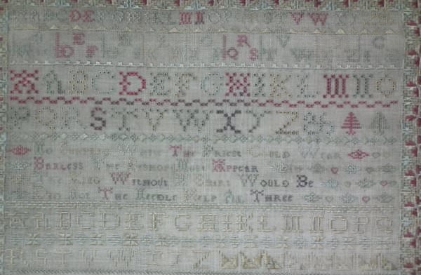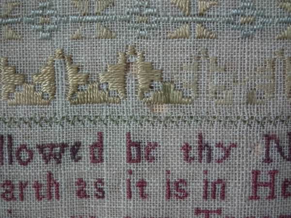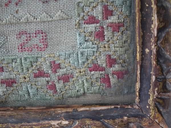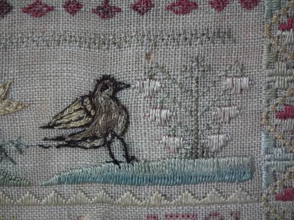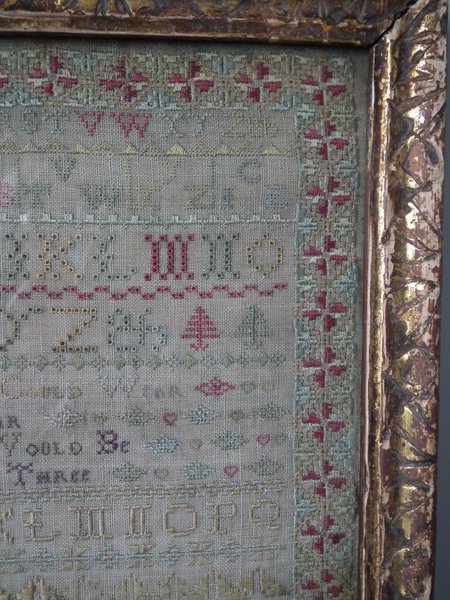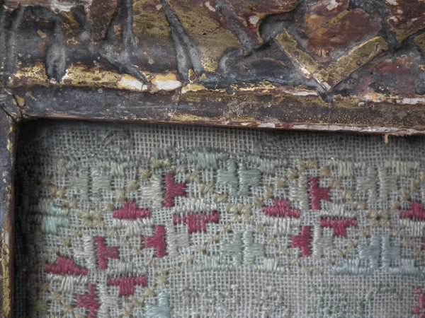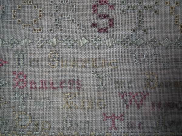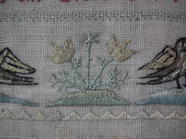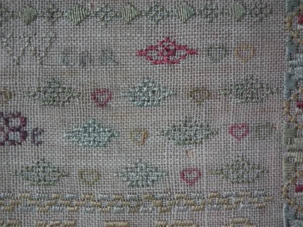 The sampler is worked in silk on linen ground, in a variety of stitches including Algerian eye.