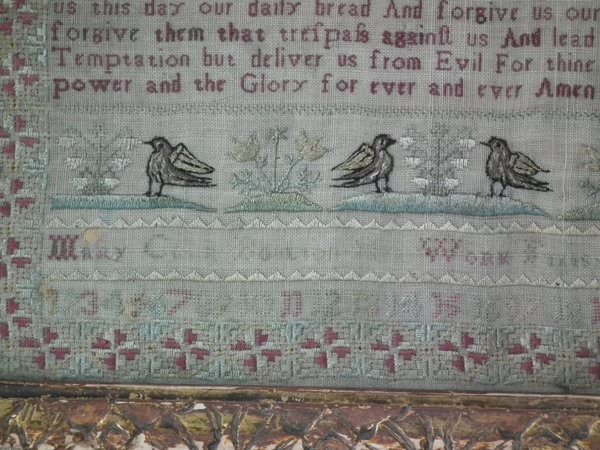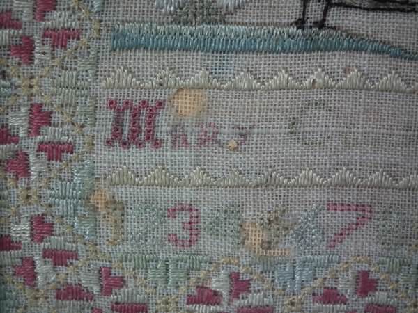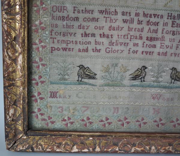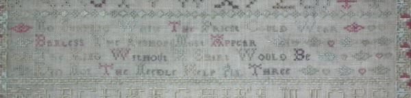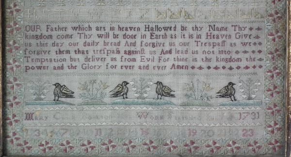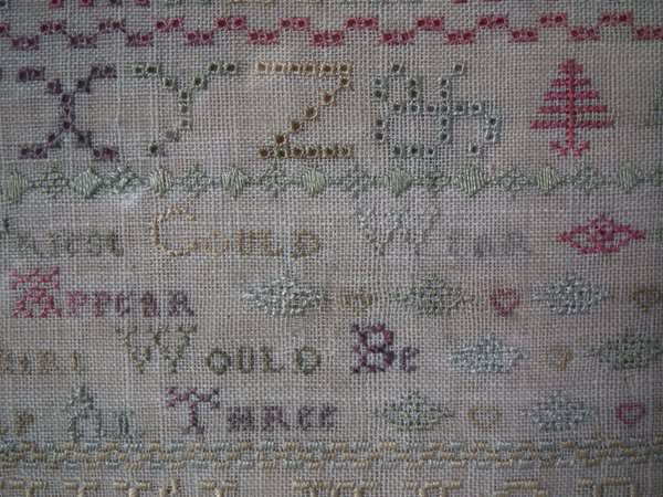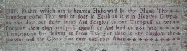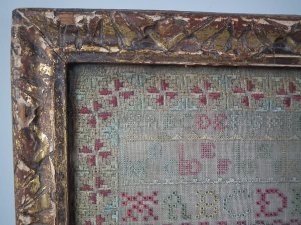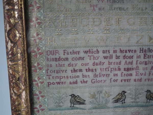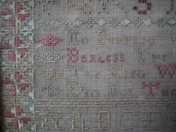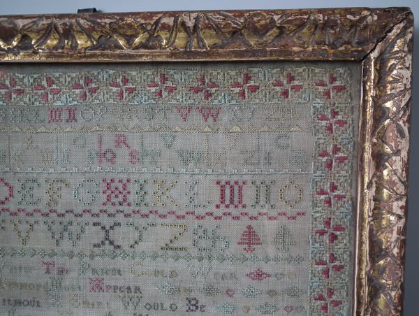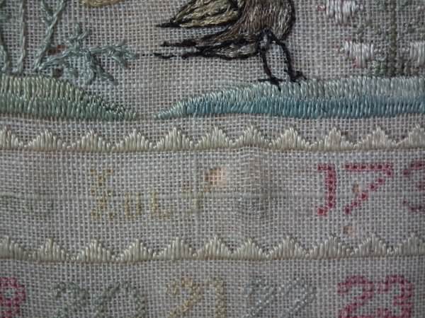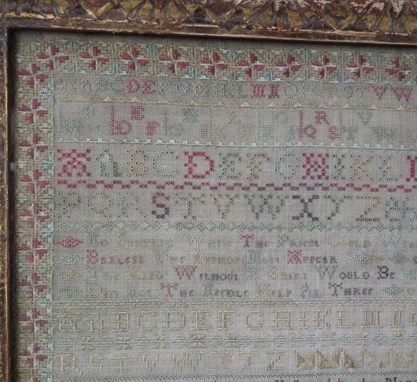 The sampler is worked in silk on linen ground, in a variety of stitches including Algerian eye.
