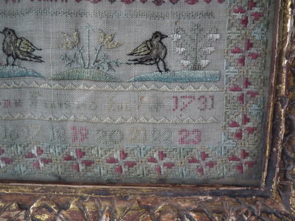 George II, dated 1731. 12ins by 10.75ins wide. Antique Sampler, 1731 sampler by Mary Boulton. Framed in an old wood frame with rippled, dimpled, old glass.