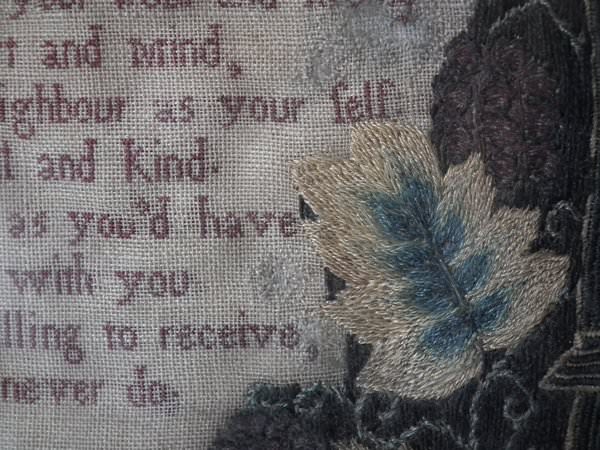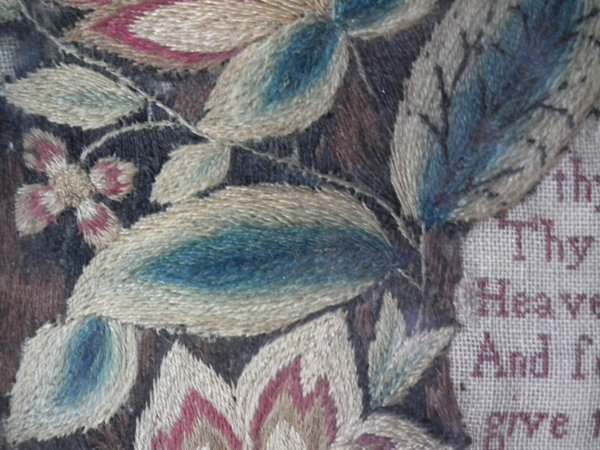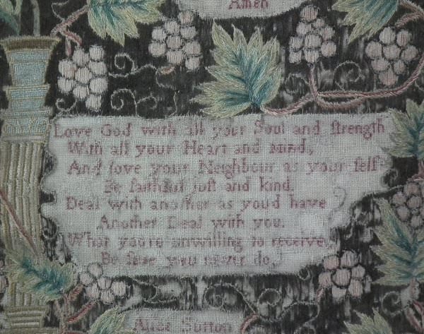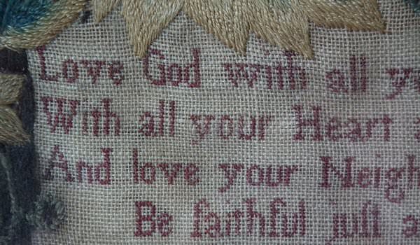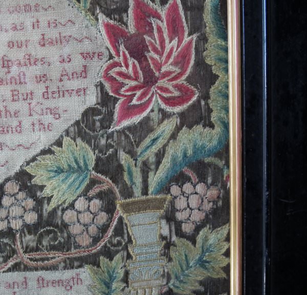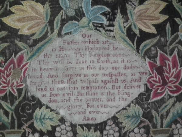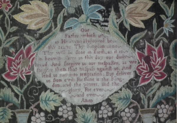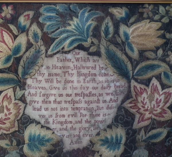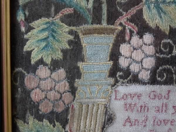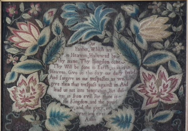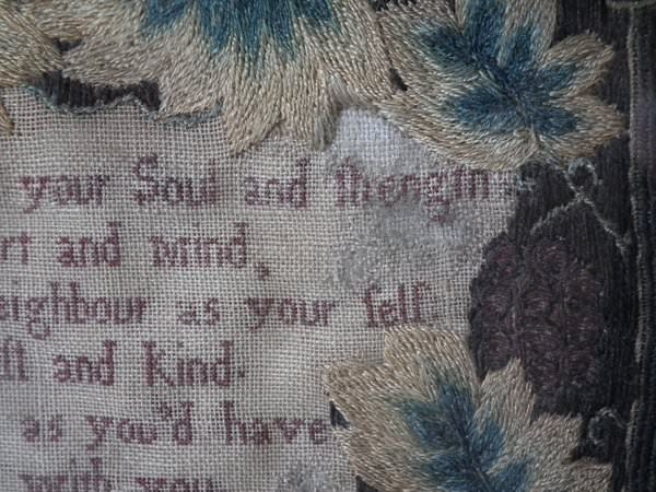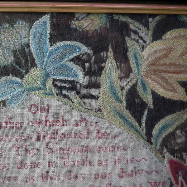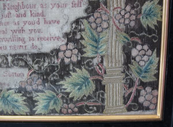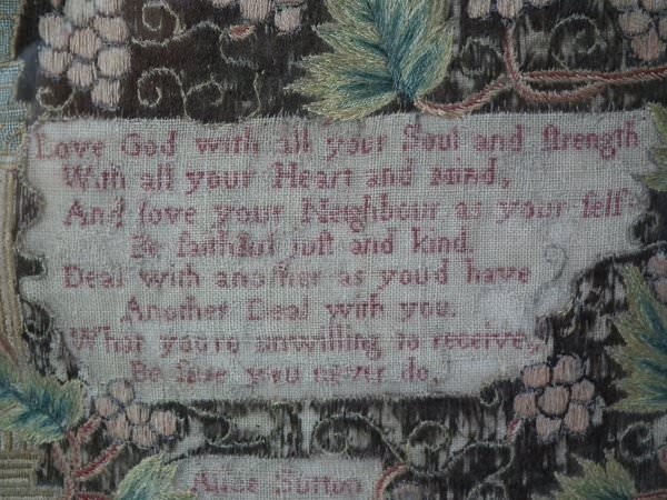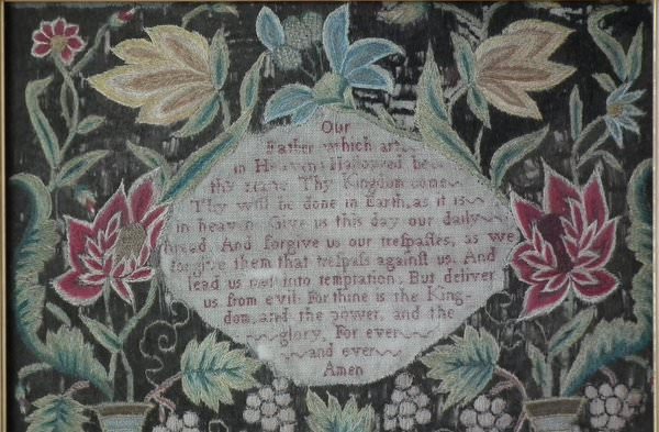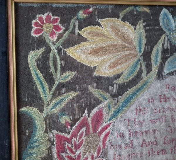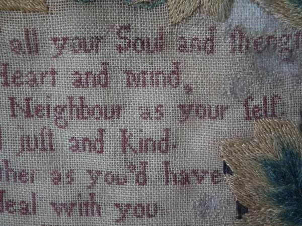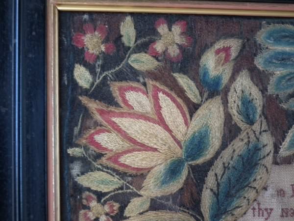 George II, dated 1742 & 1746. 11.8ins by 8.6ins wide. Pair Sister Silkwork Samplers 1742 & 1746 by Elizabeth & Alice Sutton.