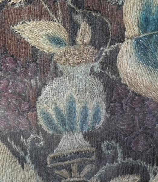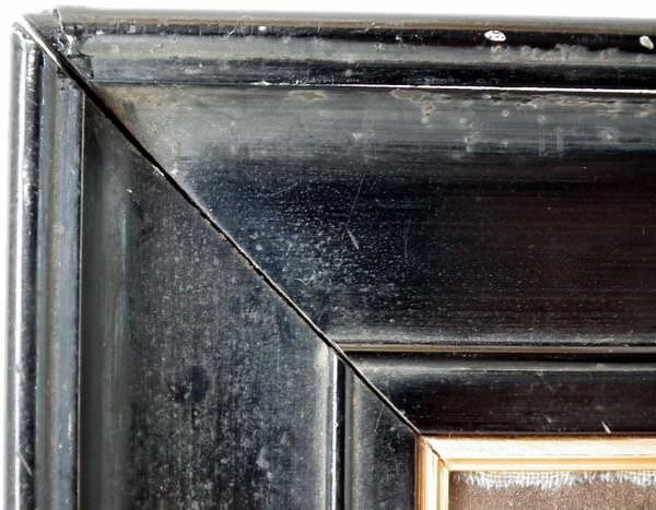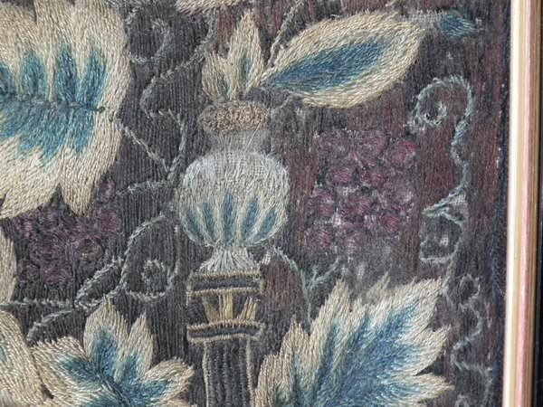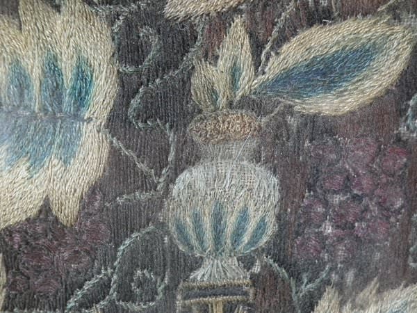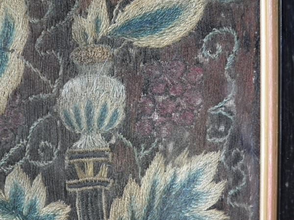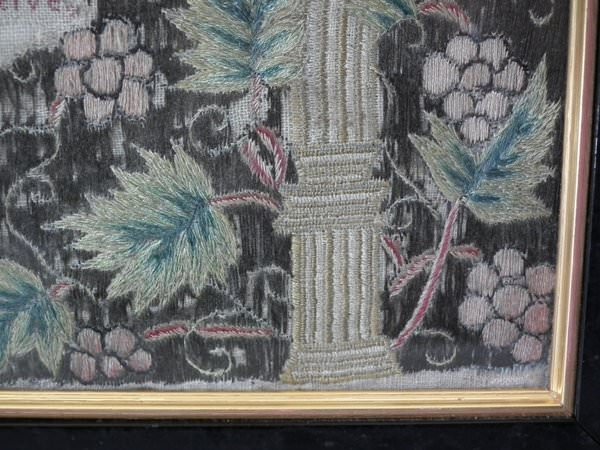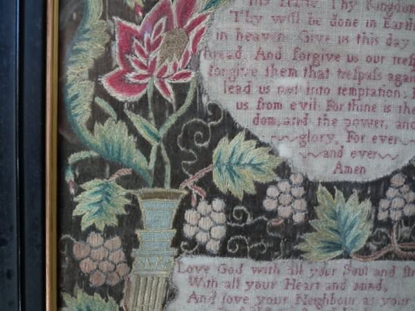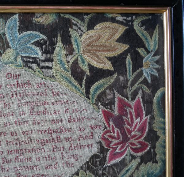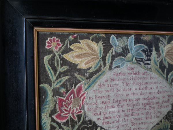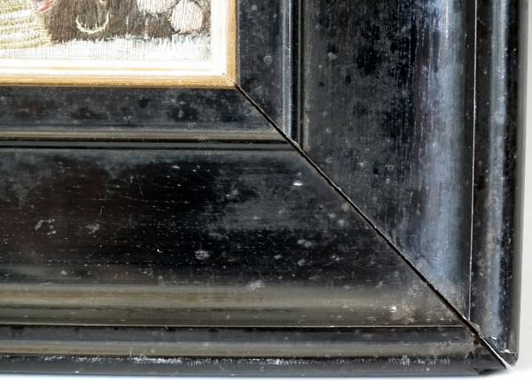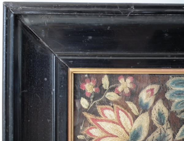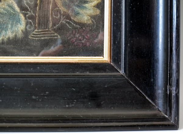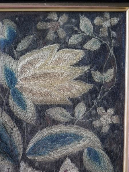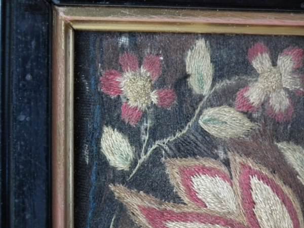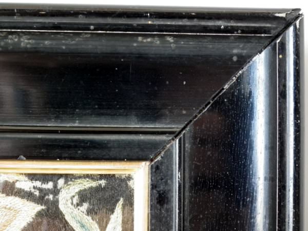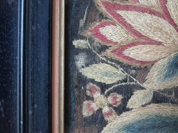 Worked in a variety of stitches. Framed in a old, black, ebonised wood frames.