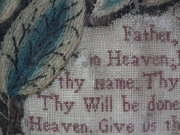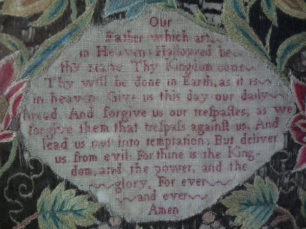 Colours brown, cream, green, copper, gold, pink, blue and red. Lord's Prayer and religious verse on both read