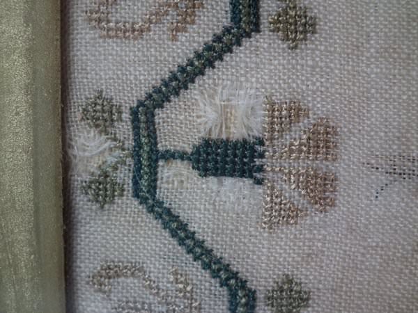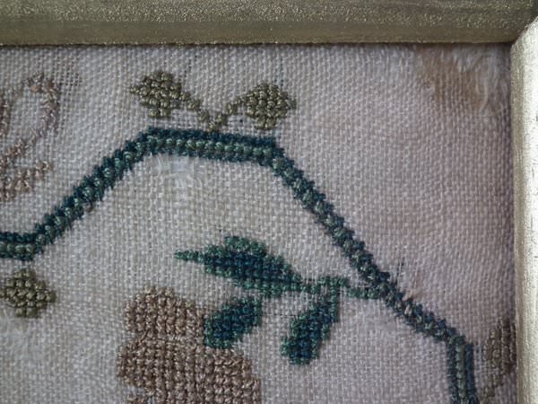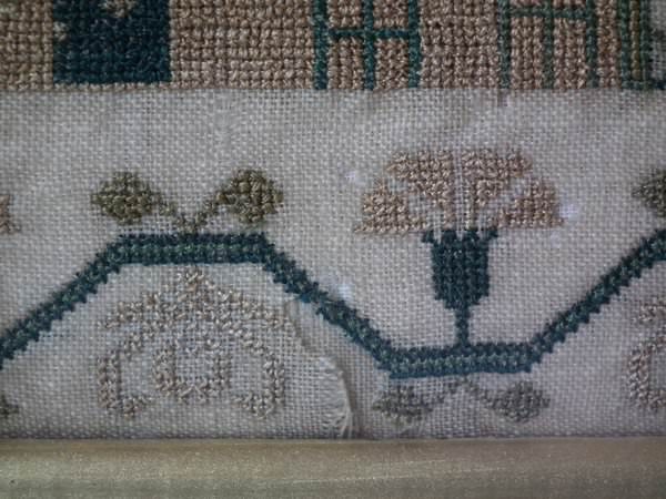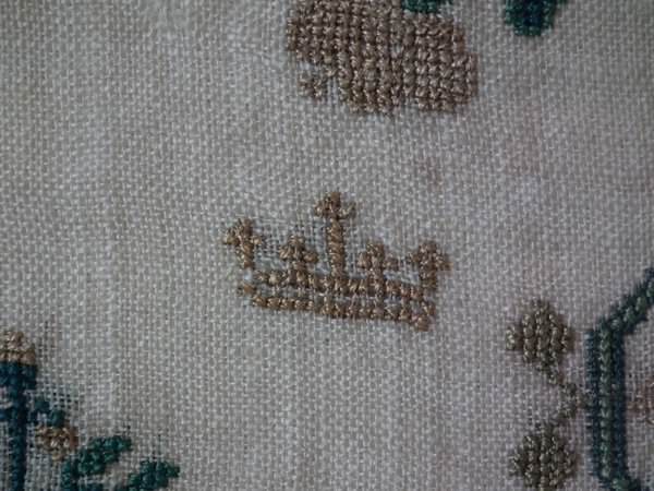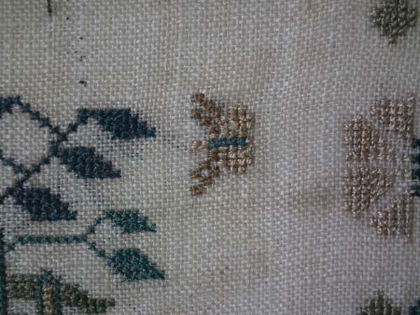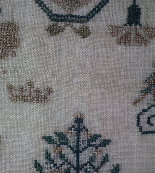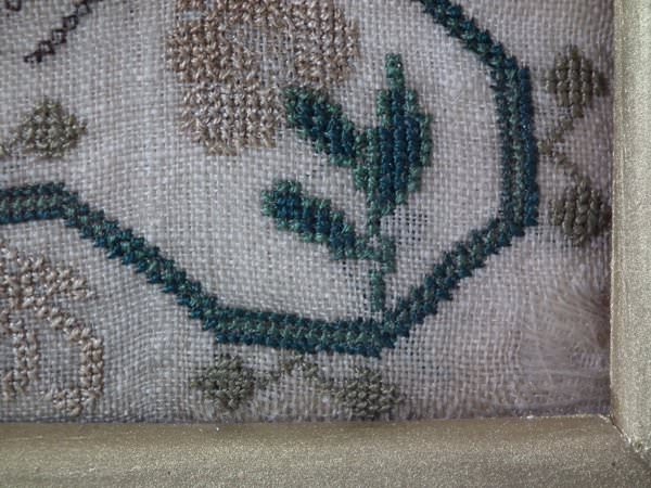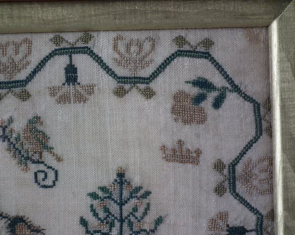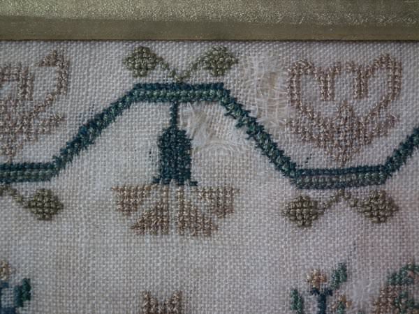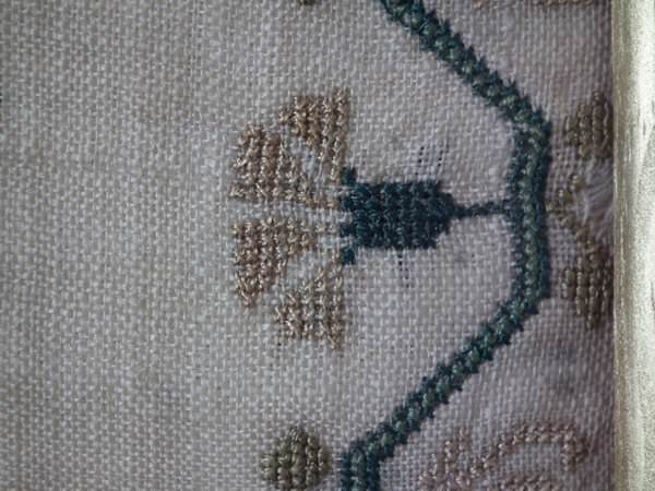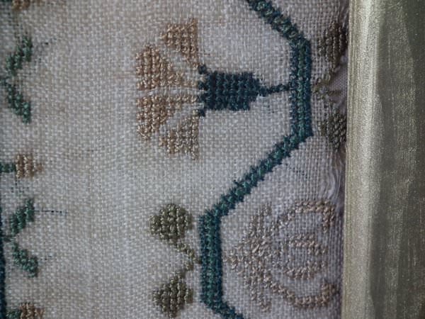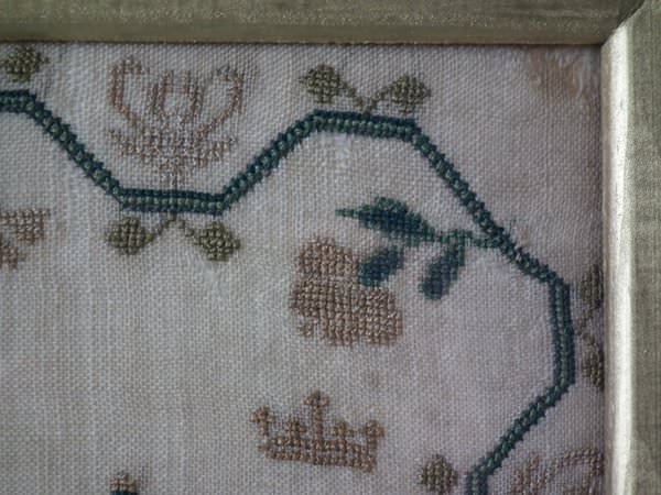 The sampler is worked in silk on linen ground, in a variety of stitches.