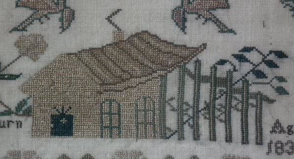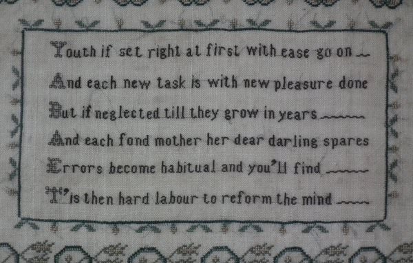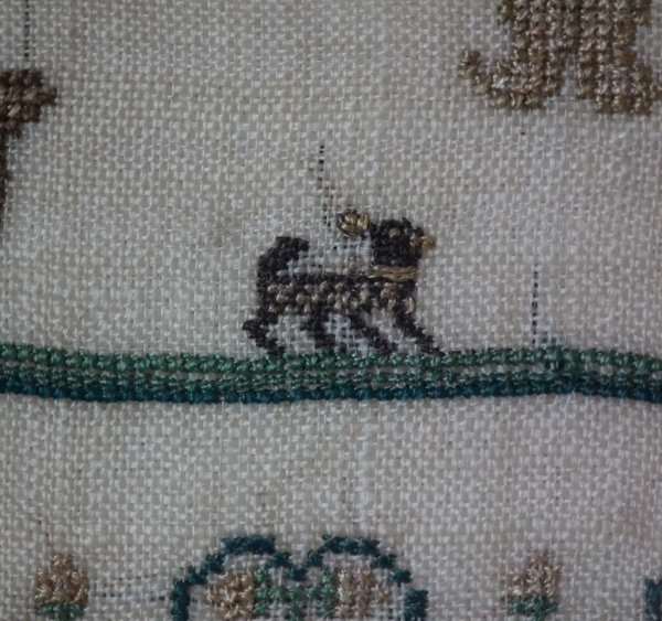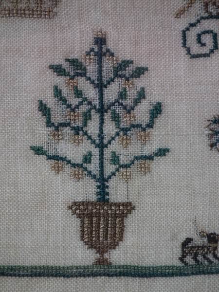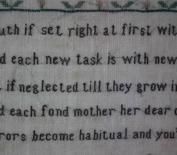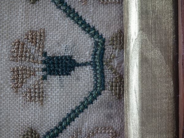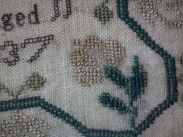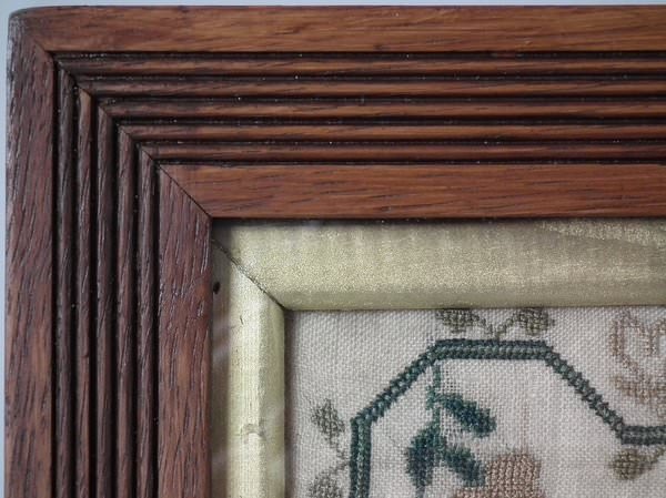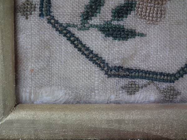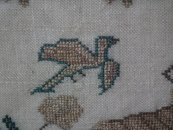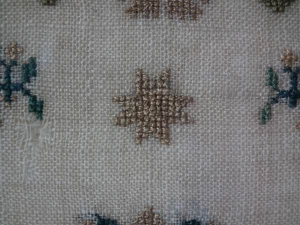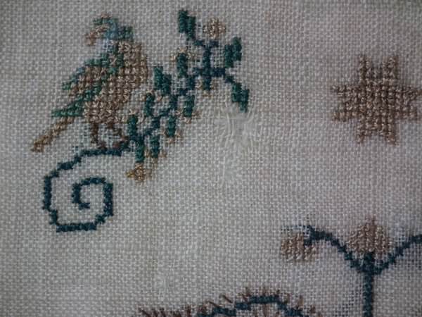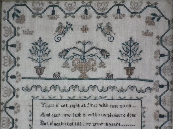 The sampler is worked in silk on linen ground, in a variety of stitches.