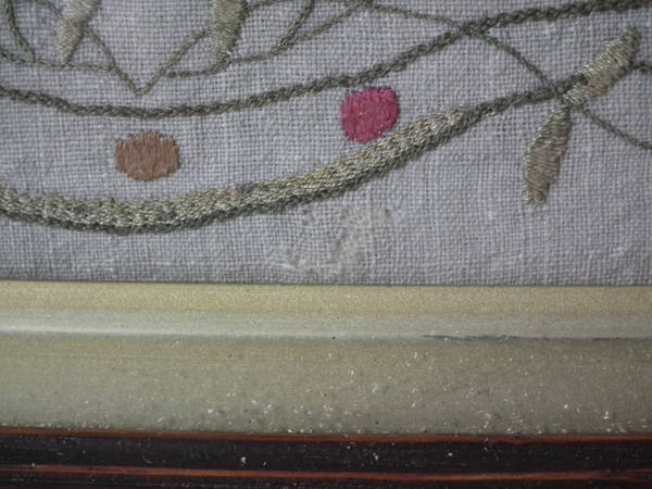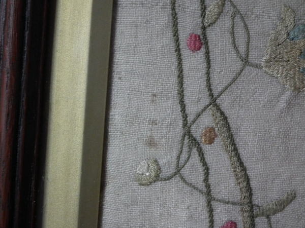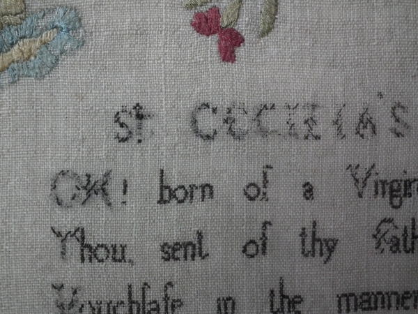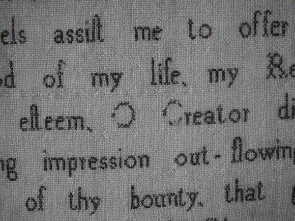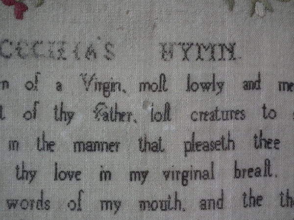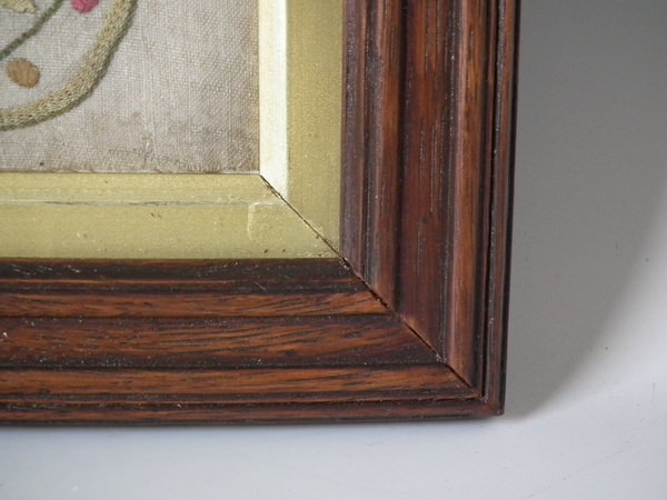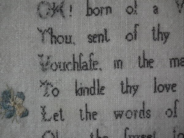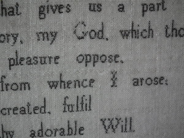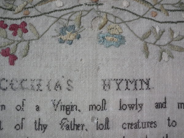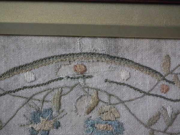 The sampler is worked in silk on linen ground, in a variety of stitches.