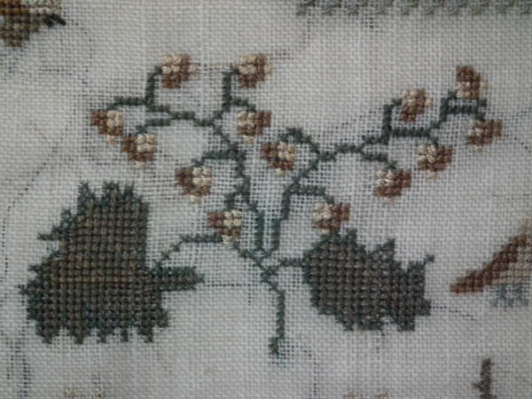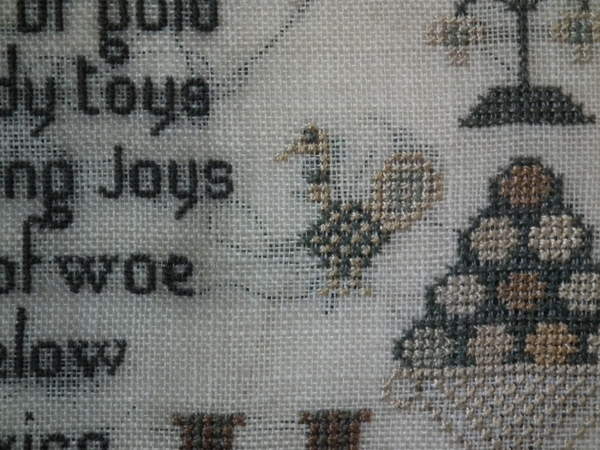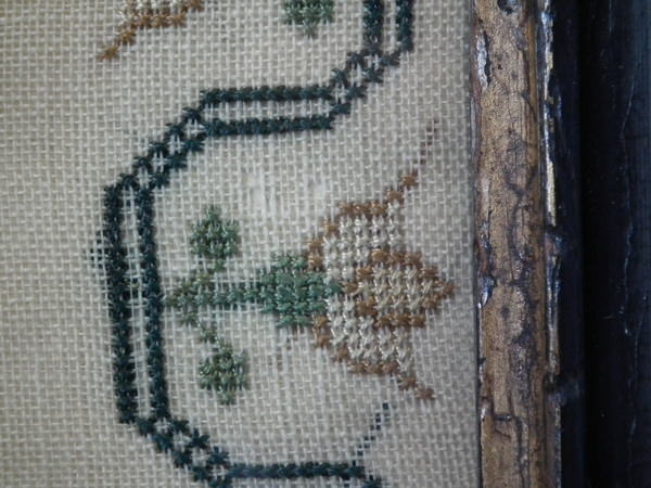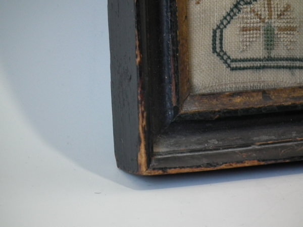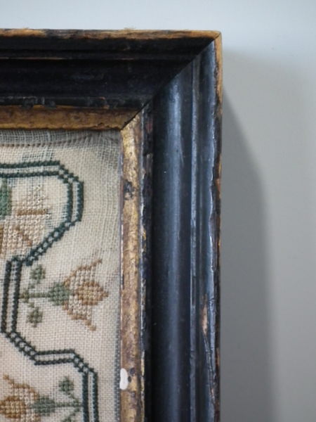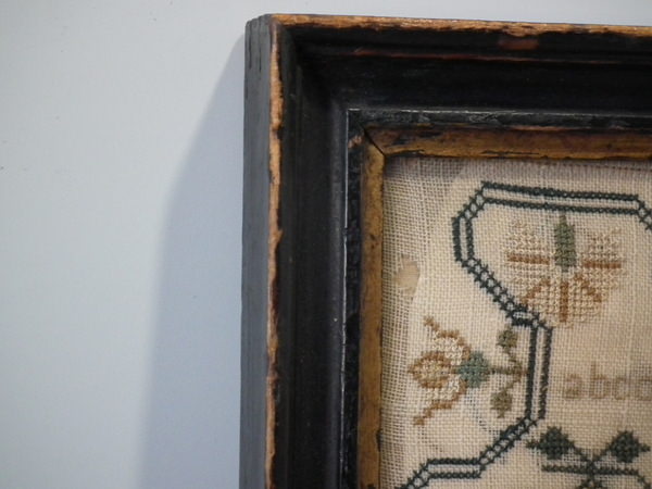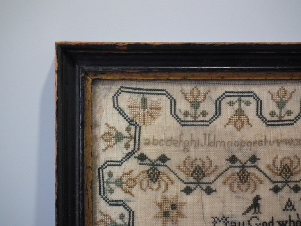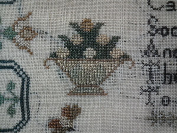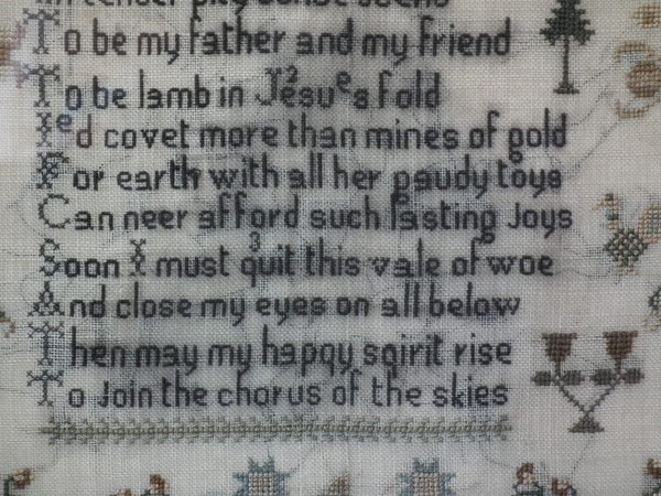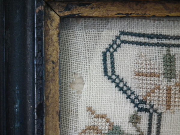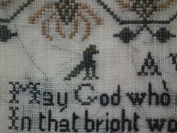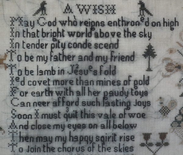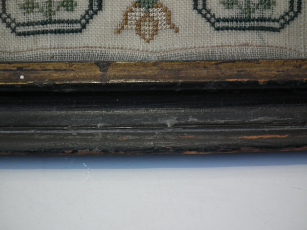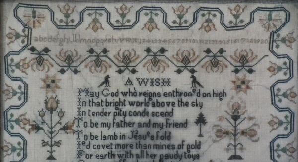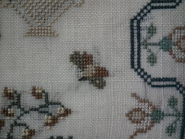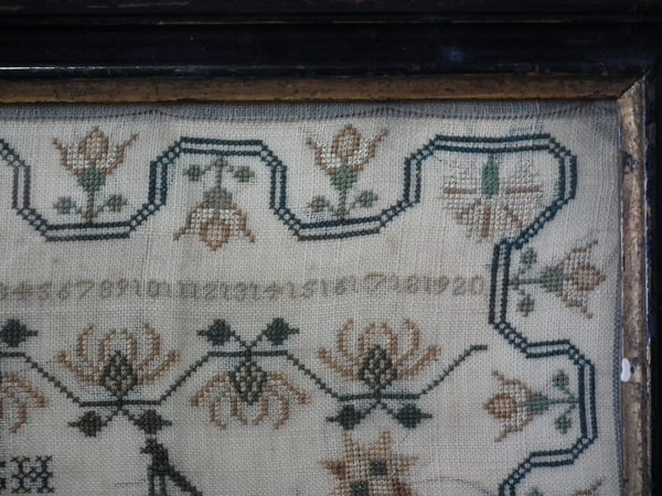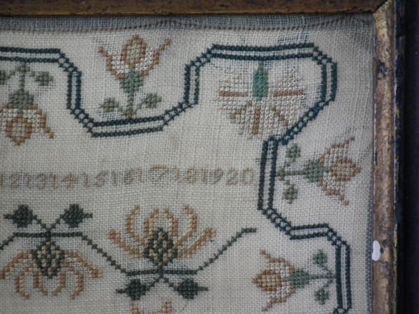 The sampler is worked in silk on linen ground, in cross stitch throughout.