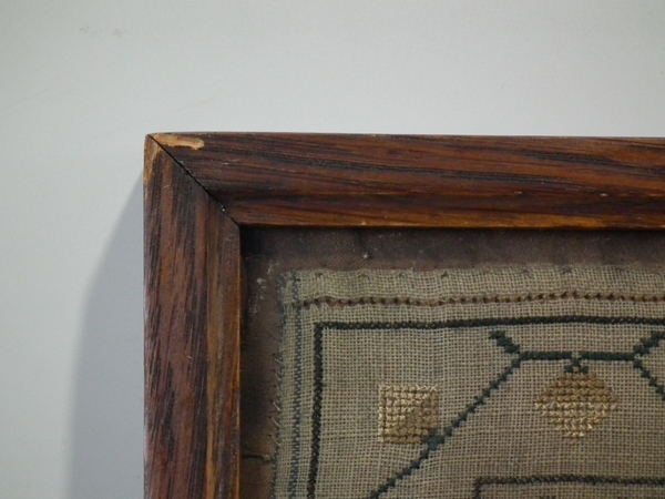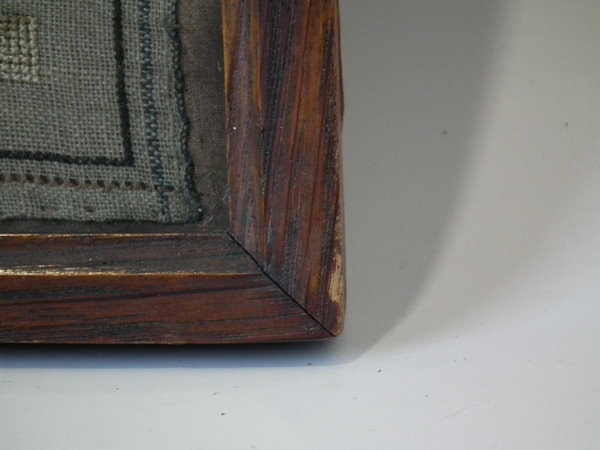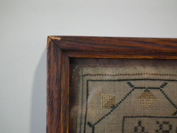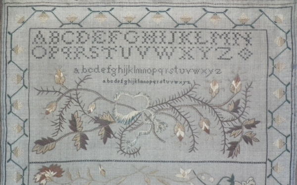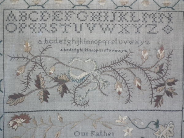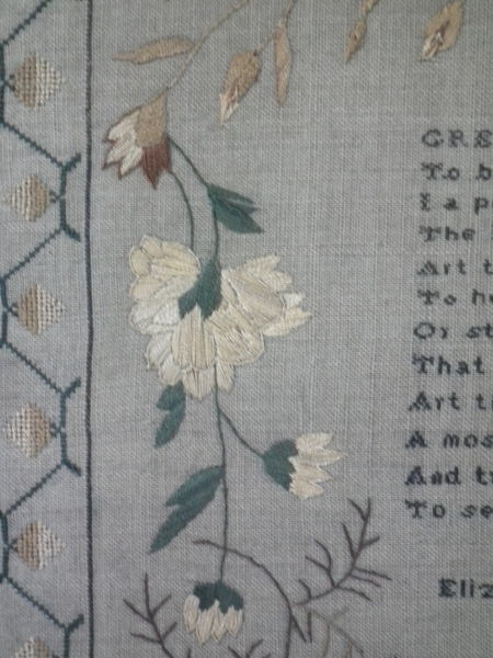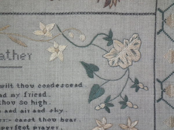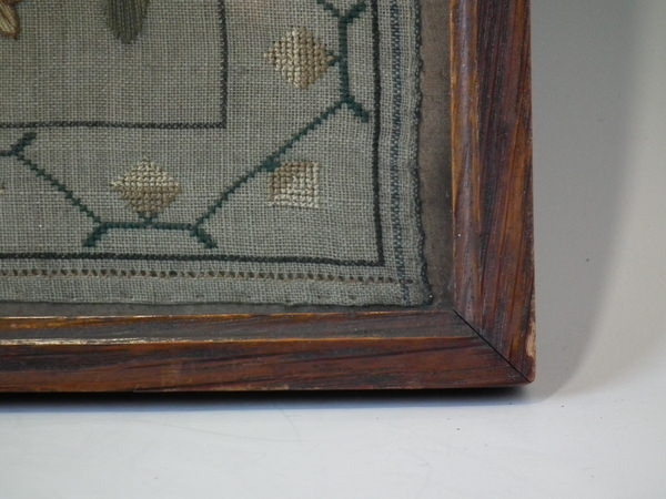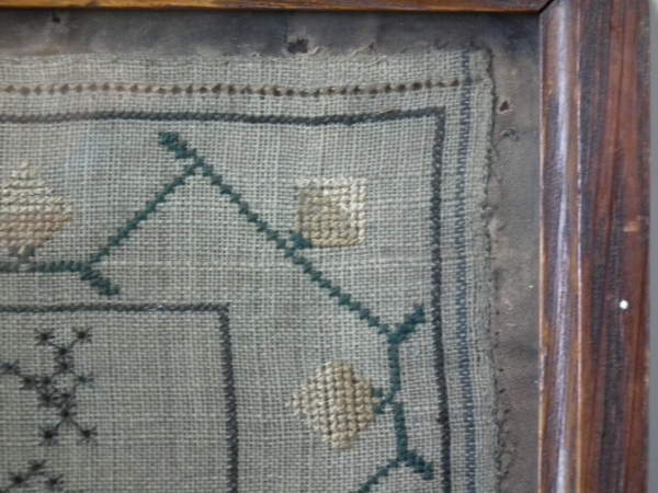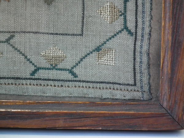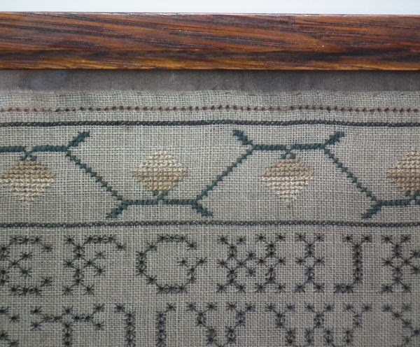The sampler is worked in silk on linen ground, in a variety of stitches including Algerian eye.