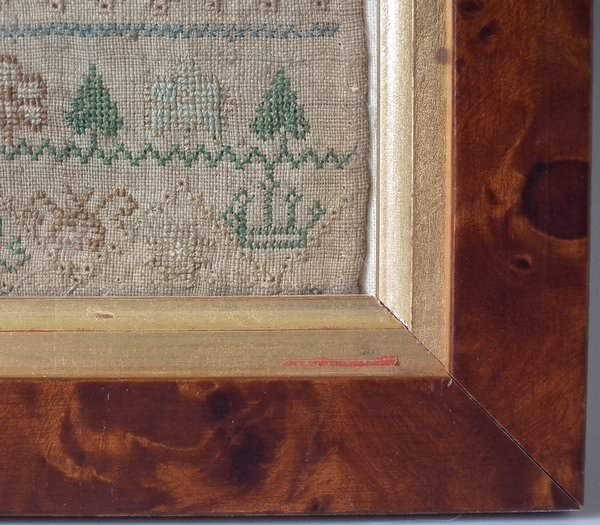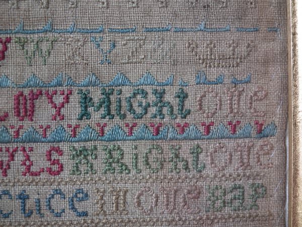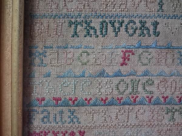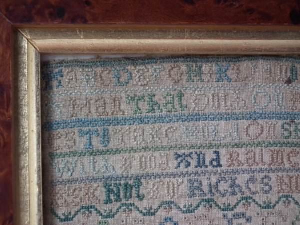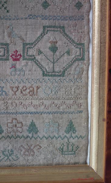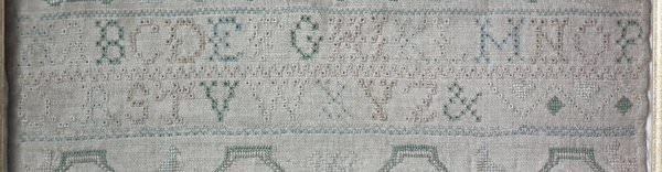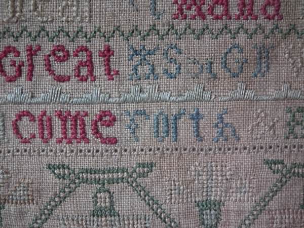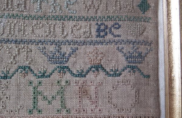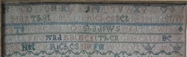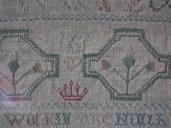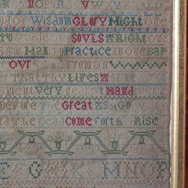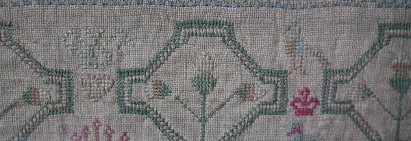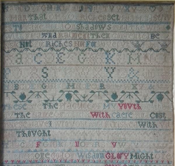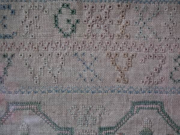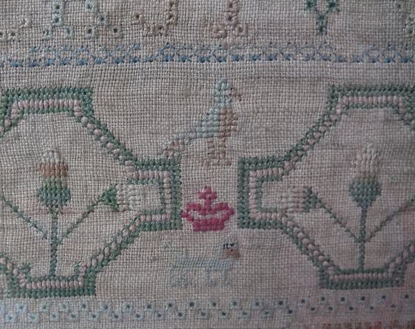 The sampler is worked in silk on linen ground, in a variety of stitches including Algerian eye.