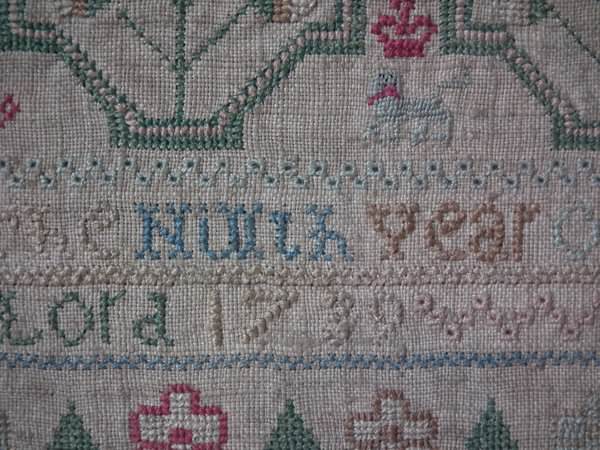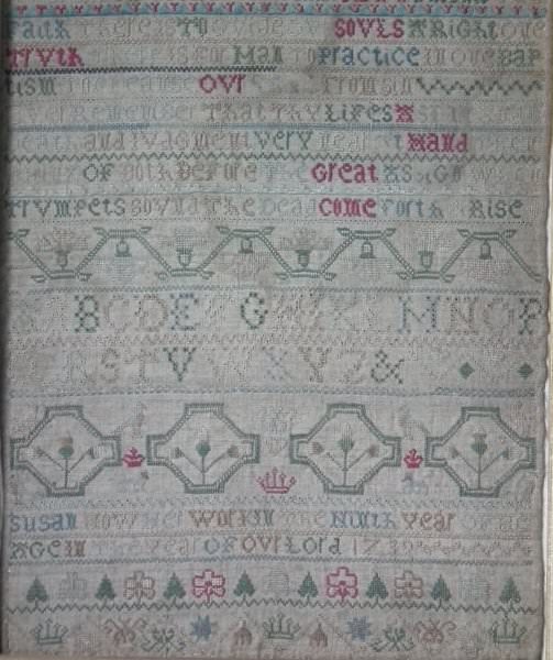 Signed and dated 'SUSAN HOW HER WORK IN THE NINTH YEAR OF HER>AGE IN THE YEAR OF OUR LORD 1739'.