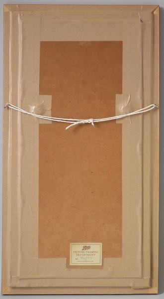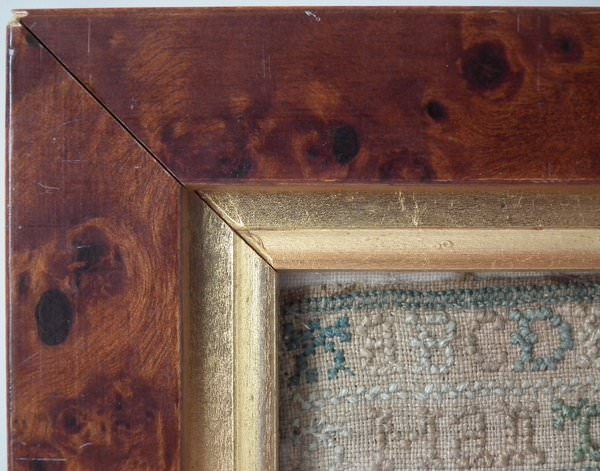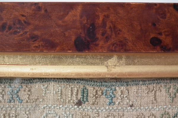 Framed in a modern wood frame with gilt slip and glass. Stitched to linen with chipboard backing.