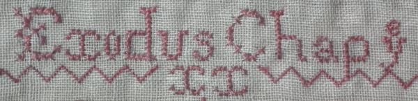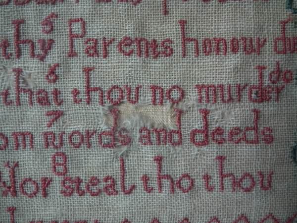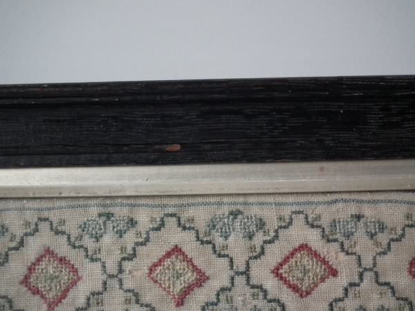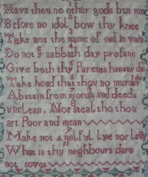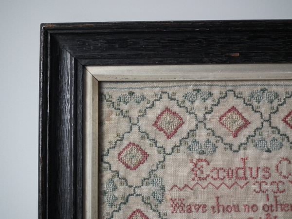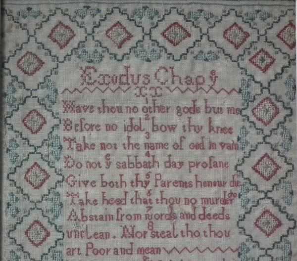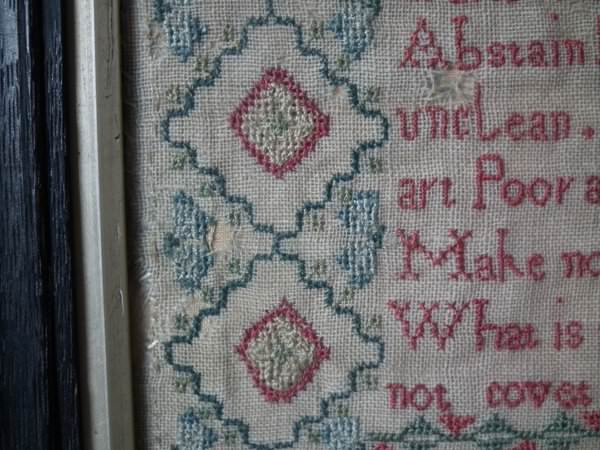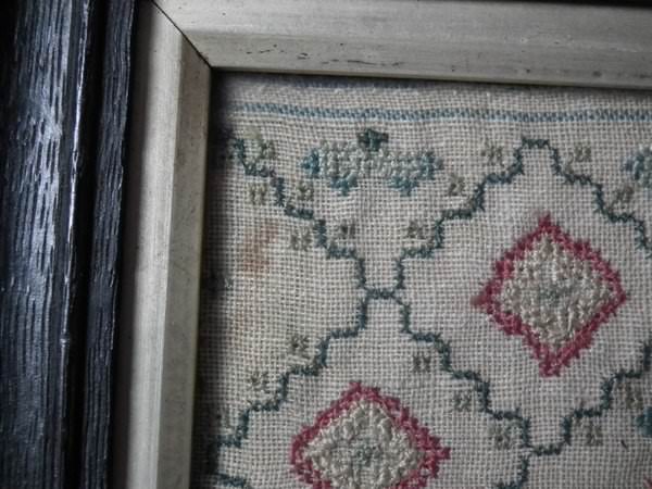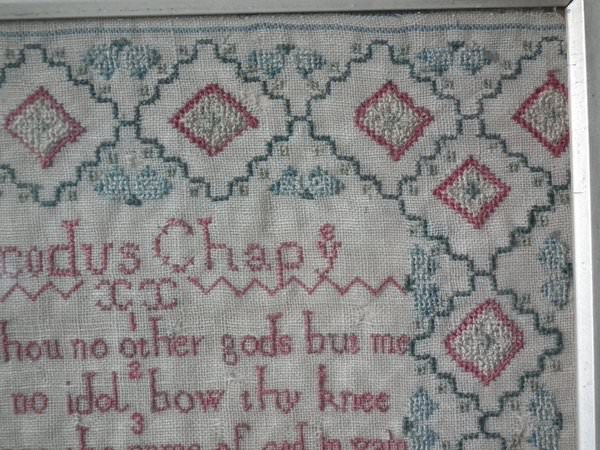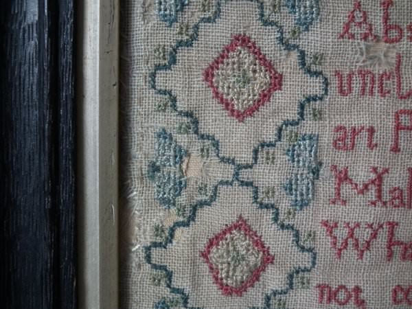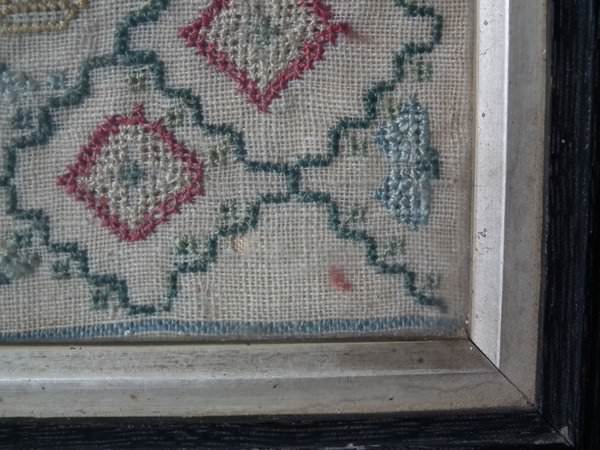 The sampler is worked in a silk-like thread on linen ground, in cross stitch throughout.