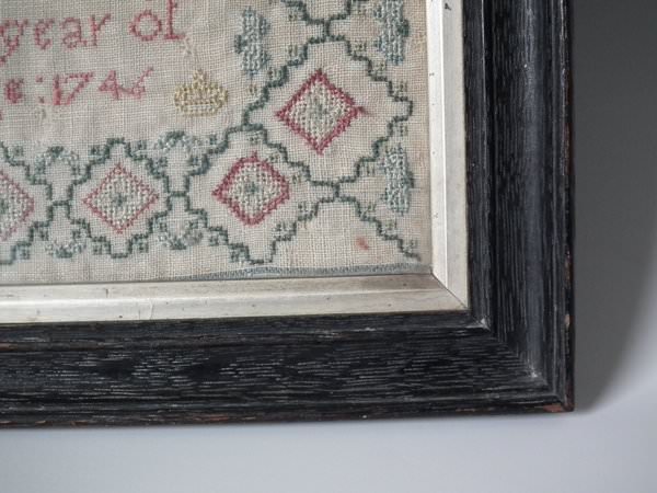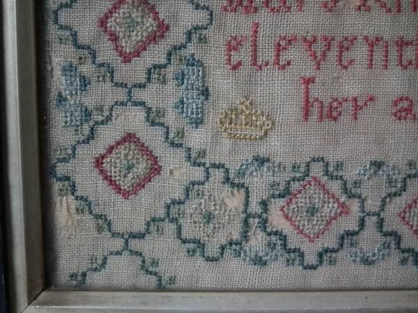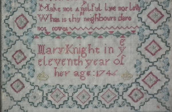 George II, dated 1746. 12ins by 8ins wide. Antique Sampler, 1746, by Mary Knight.
