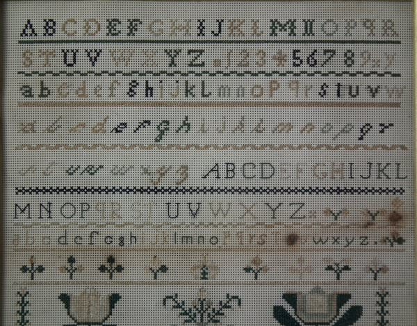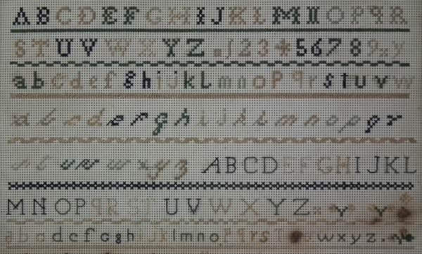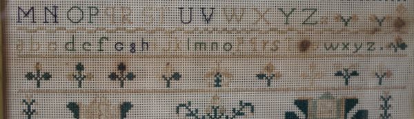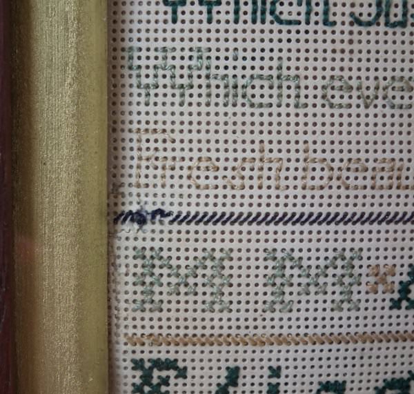The sampler is worked in a silk-like thread on punched paper ground, in a variety of stitches.