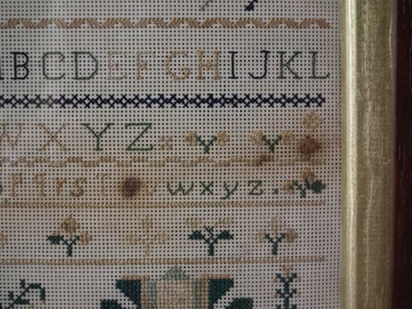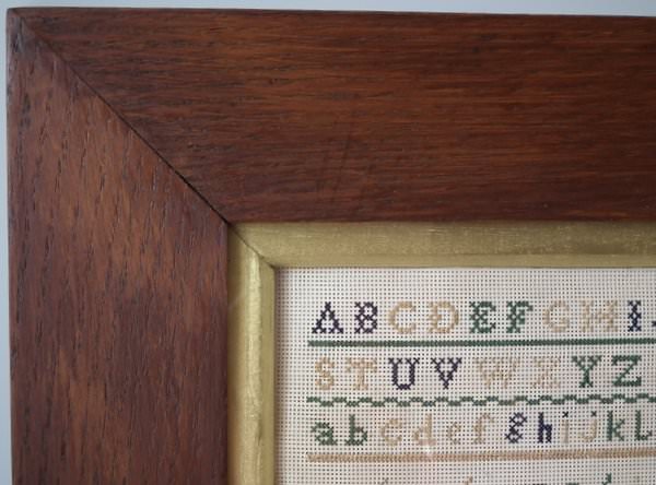 Victorian, dated April 1857. 10.75ins by 7.25ins wide. 1857 Paper Sampler by Elizabeth McMillan. Framed in an old wood frame with gilt slip and glass.