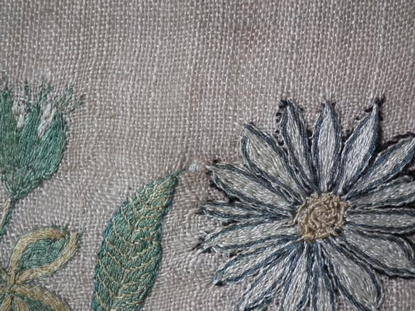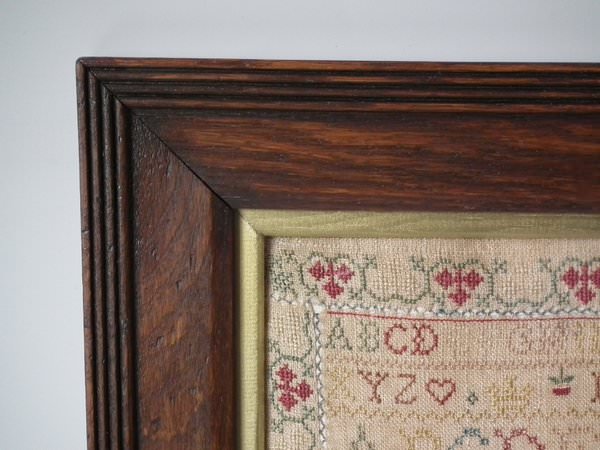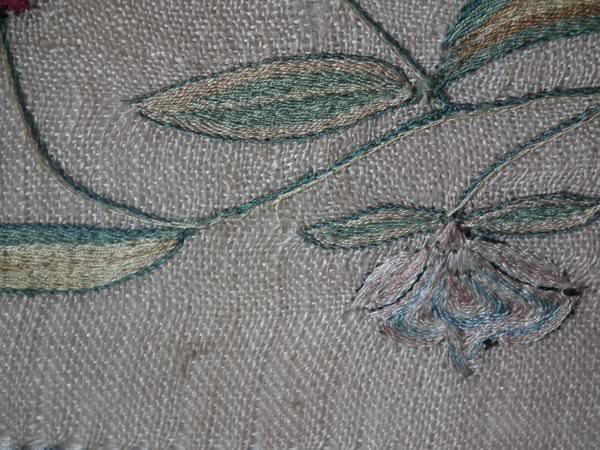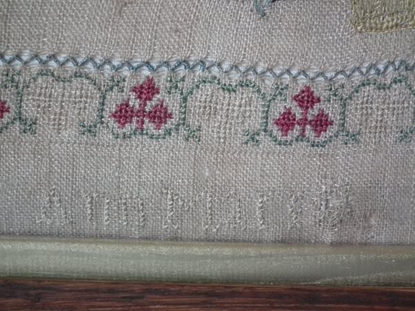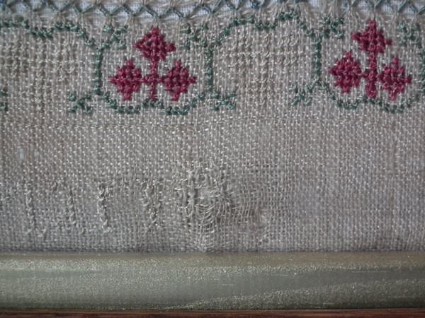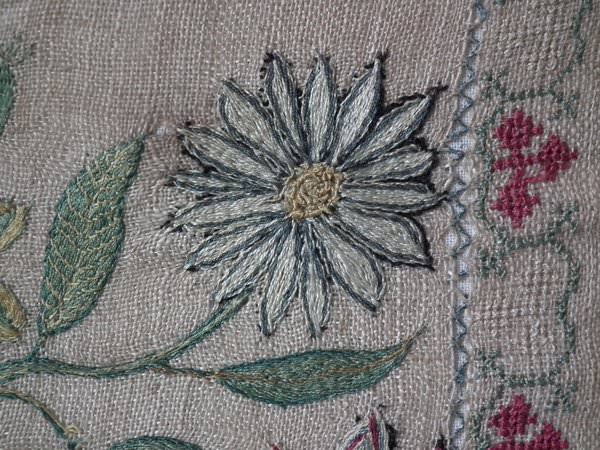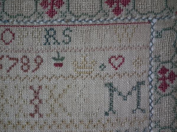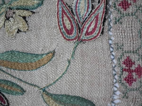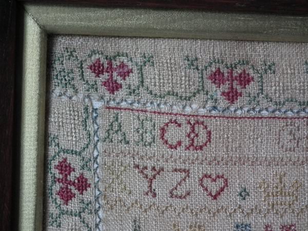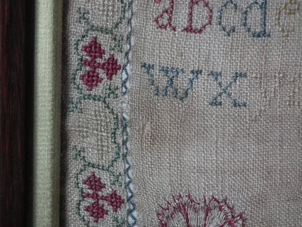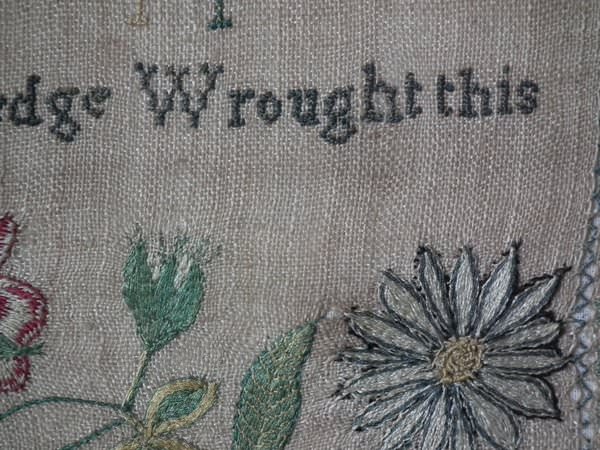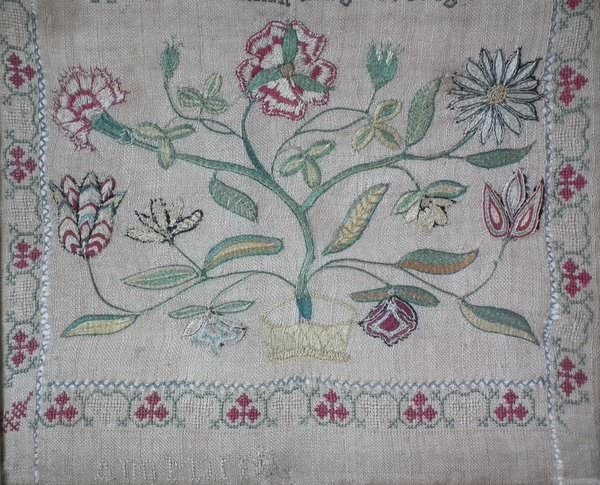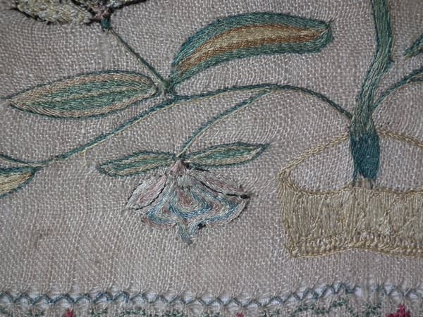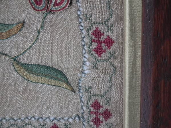 The sampler is worked in silk on linen ground, in a variety of stitches including Algerian eye.