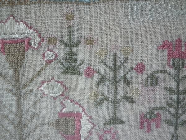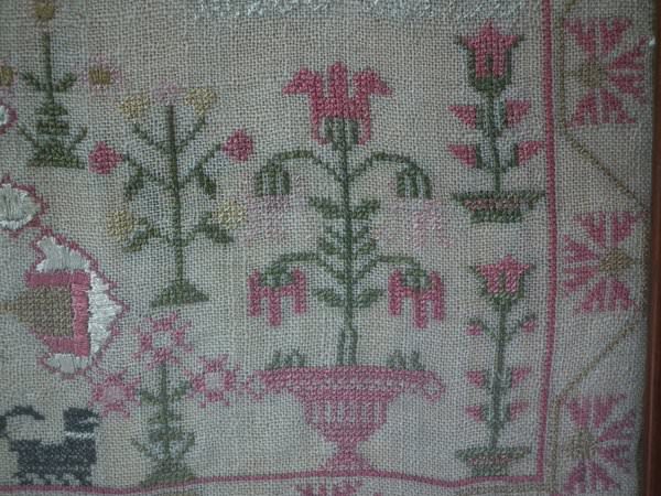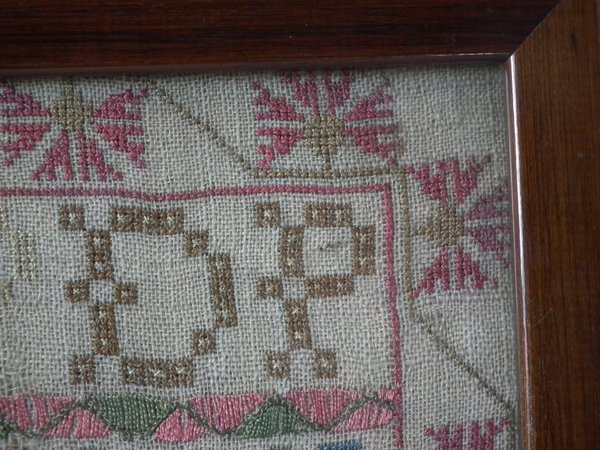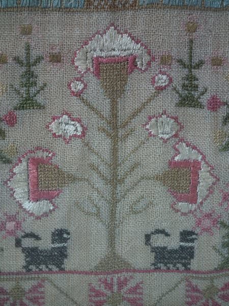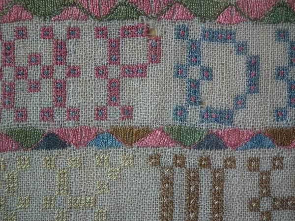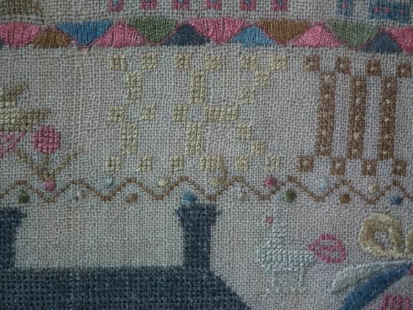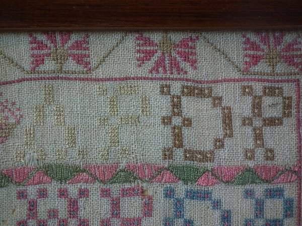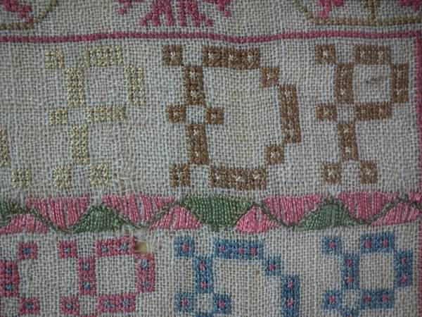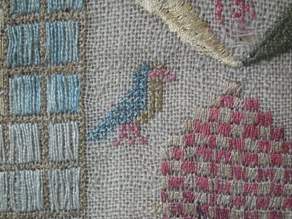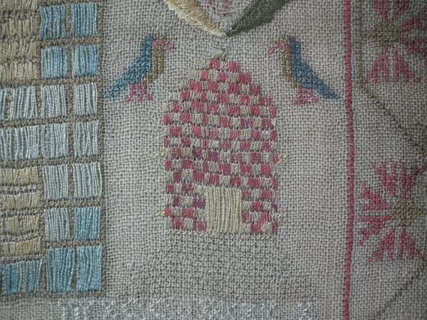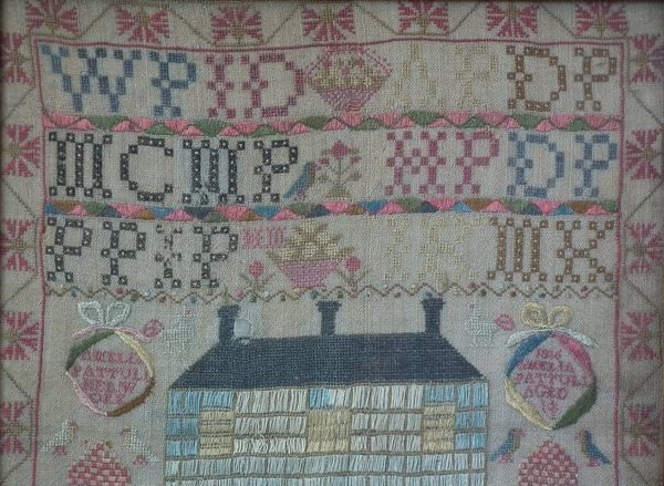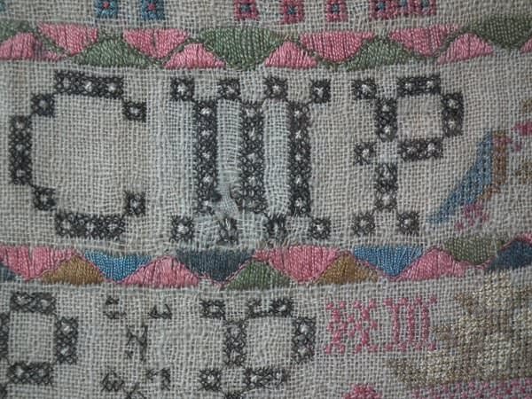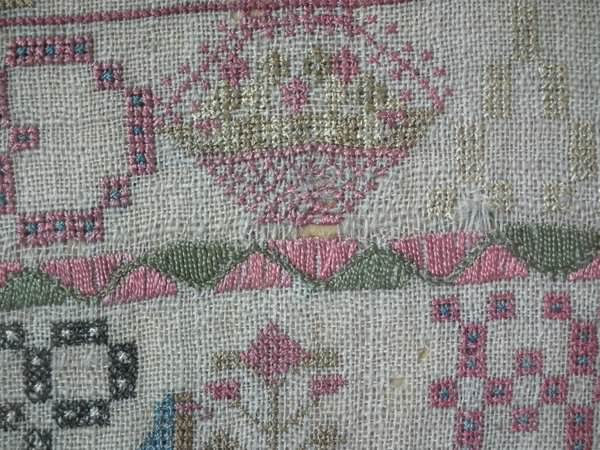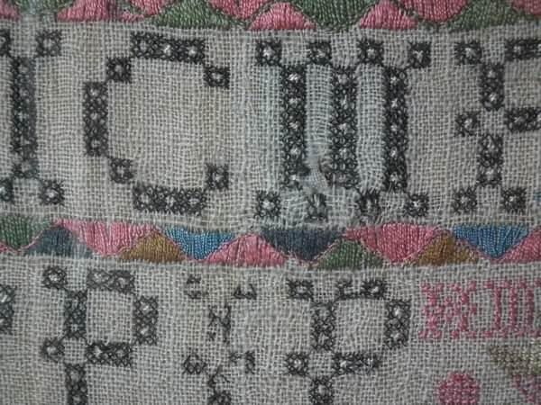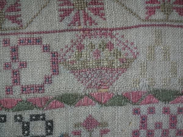 The sampler is worked in silk on linen ground, in a variety of stitches including Algerian eye.