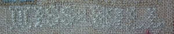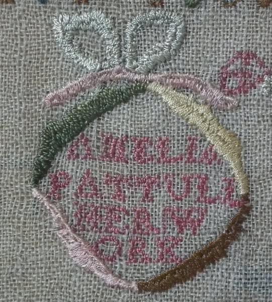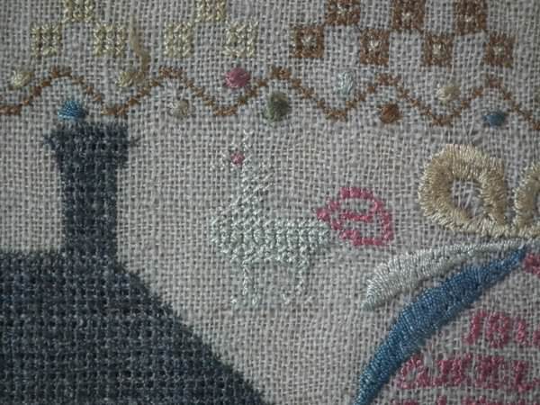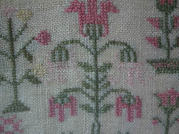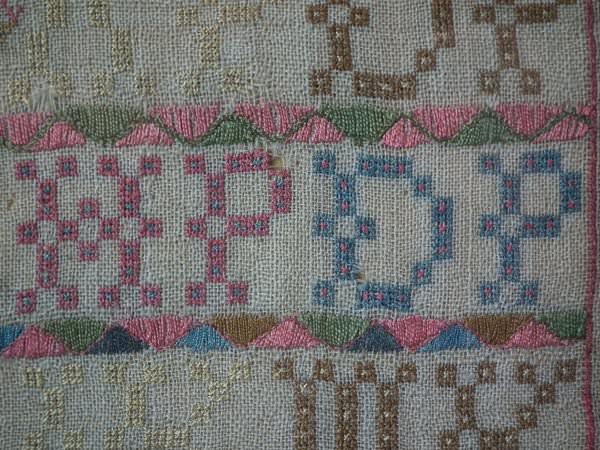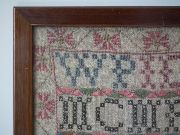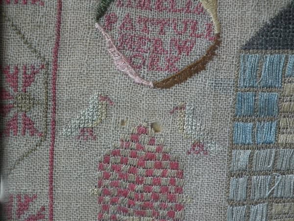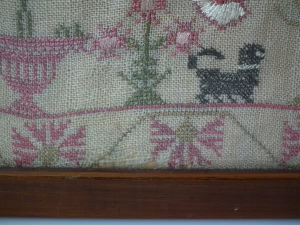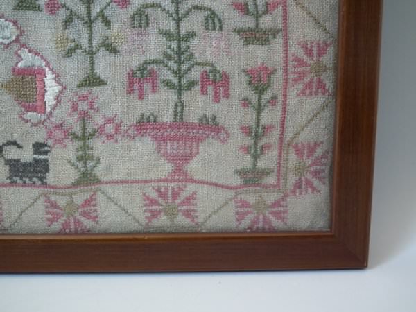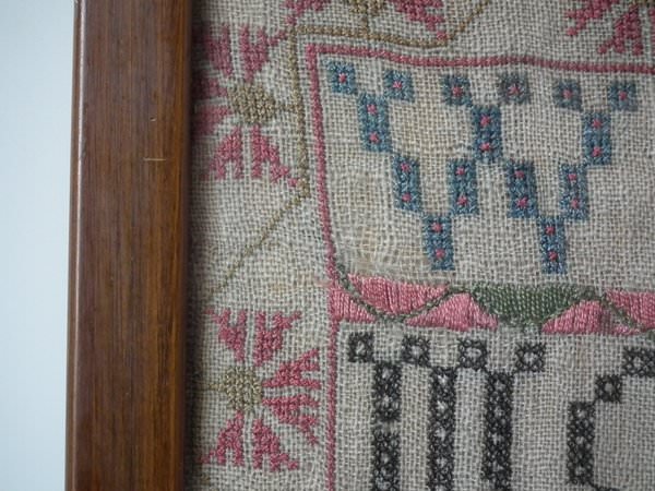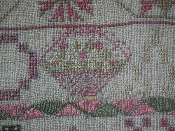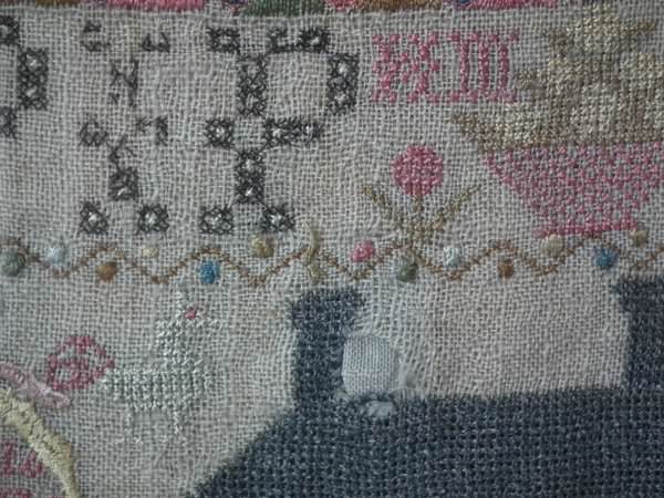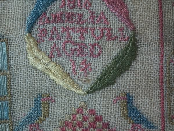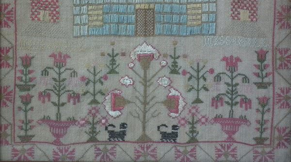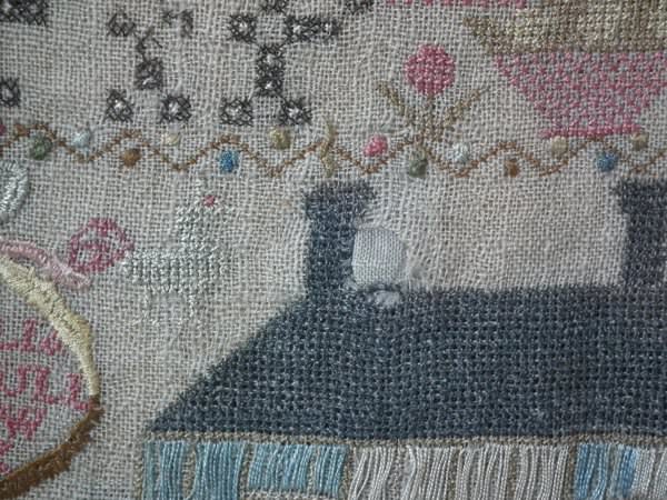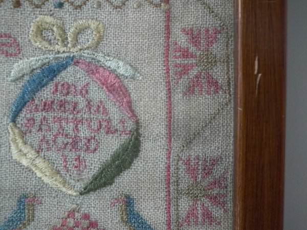 The sampler is worked in silk on linen ground, in a variety of stitches including Algerian eye.