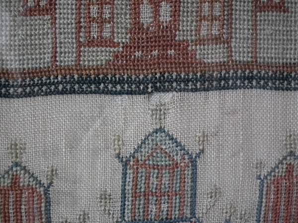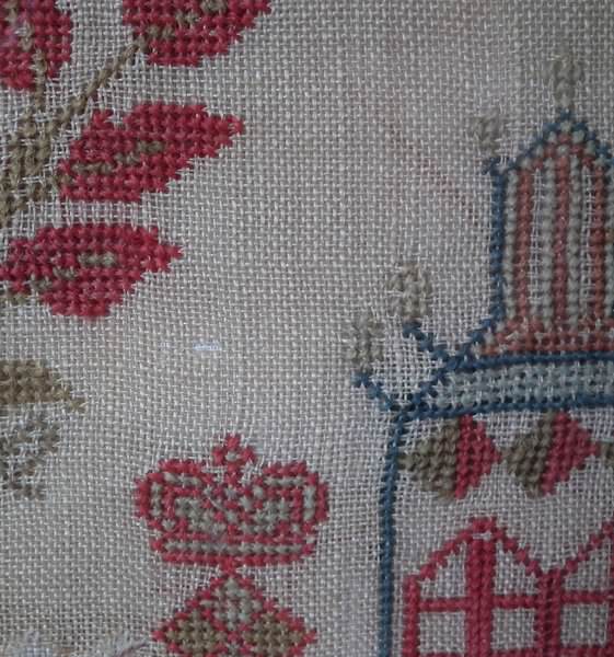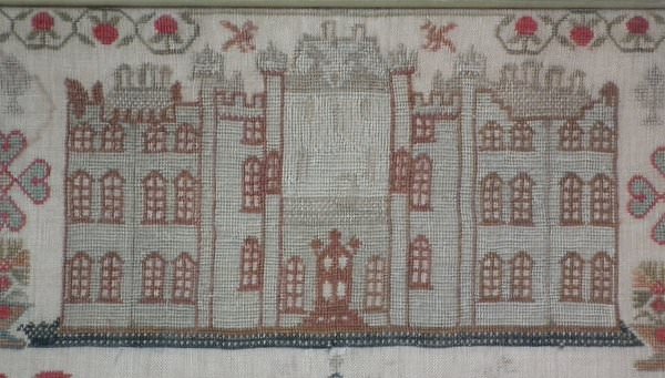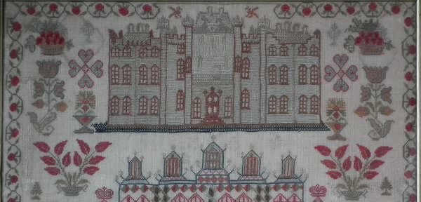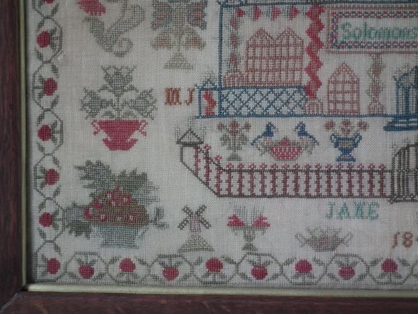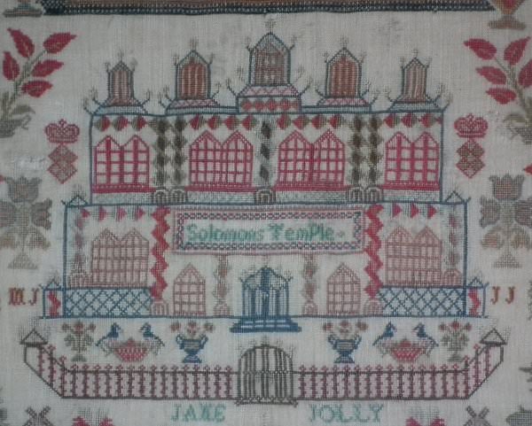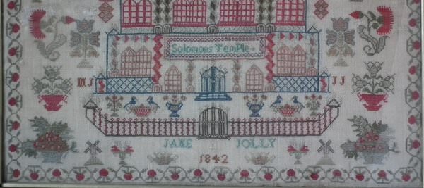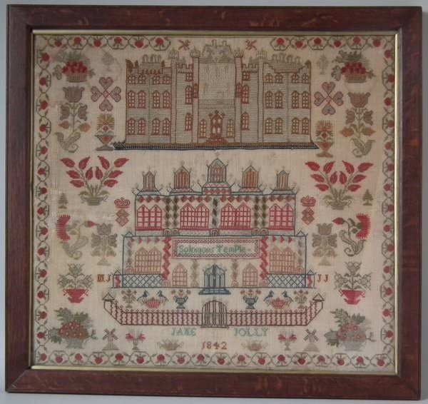 Victorian, dated 1842. 20ins high by 21.5ins wide. Antique Sampler, 1842 Solomon's Temple & Castle Sampler by Jane Jolly.
