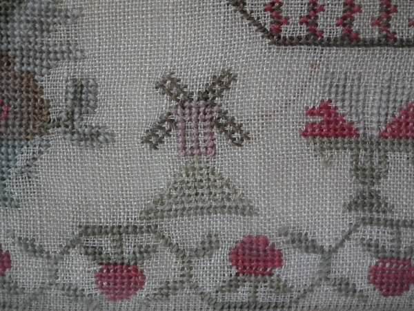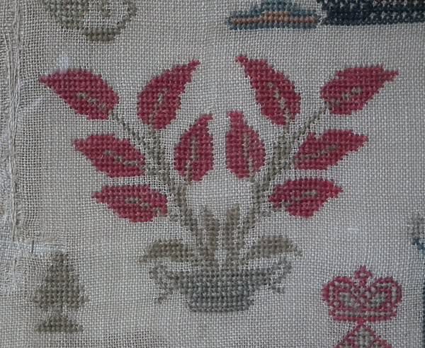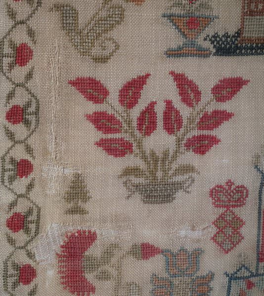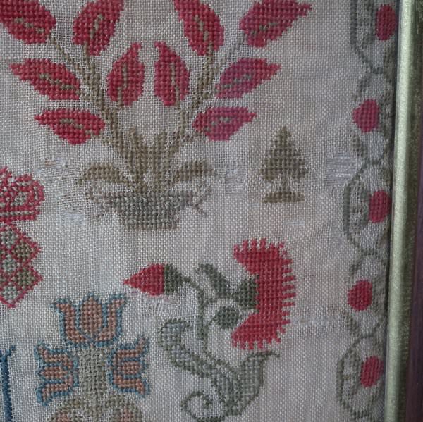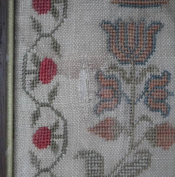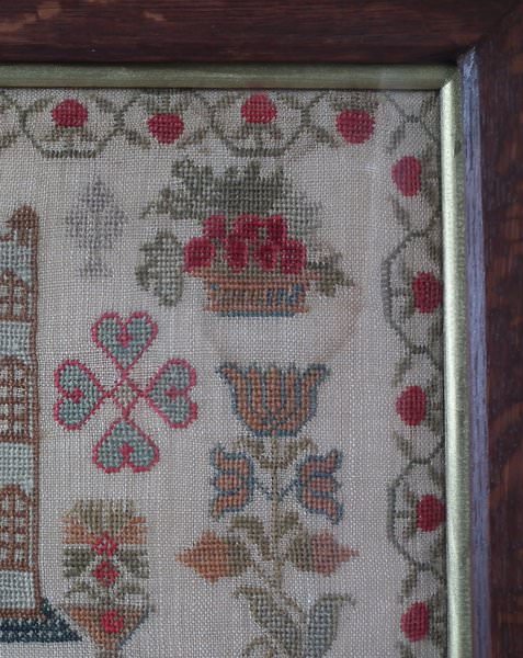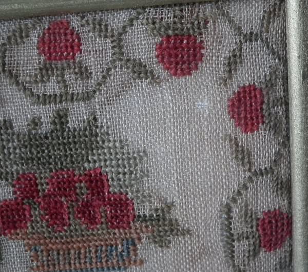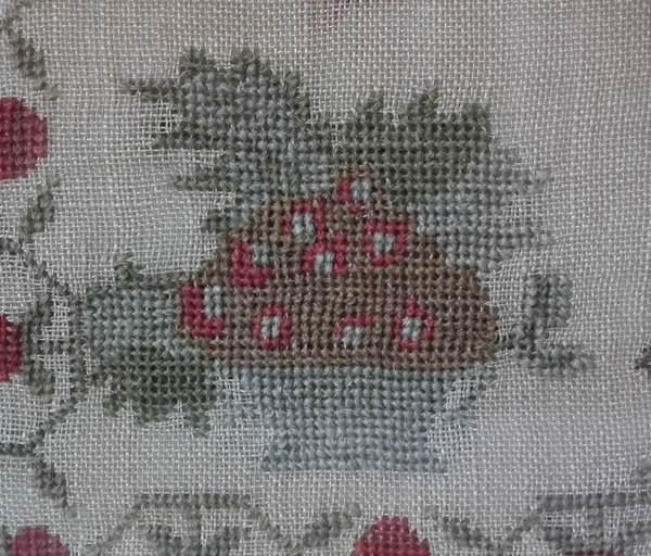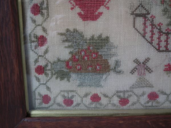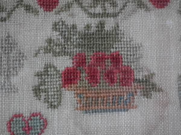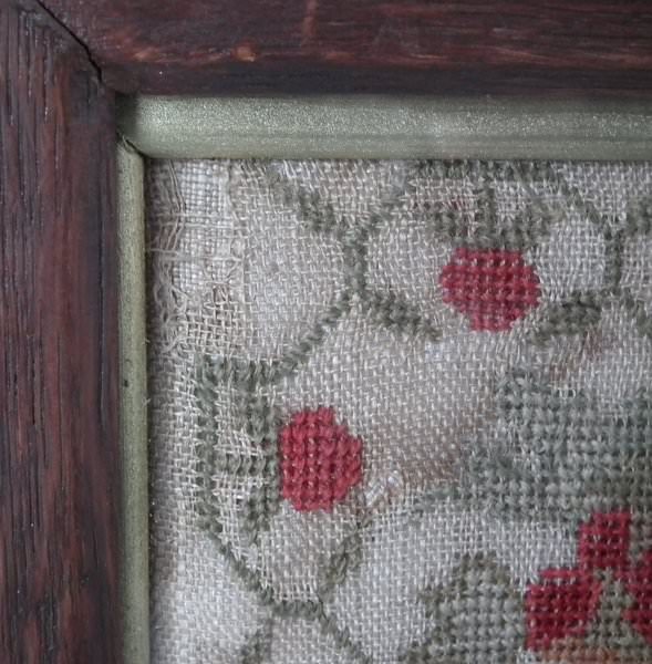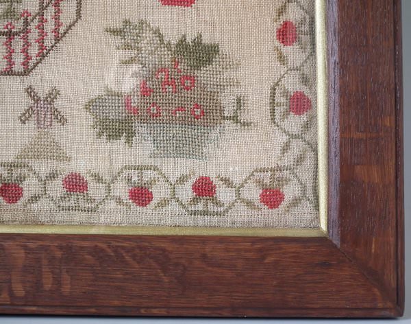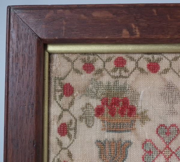 The sampler is worked in cotton and fine wool on a canvas ground, in cross stitch throughout. Meandering strawberry border.