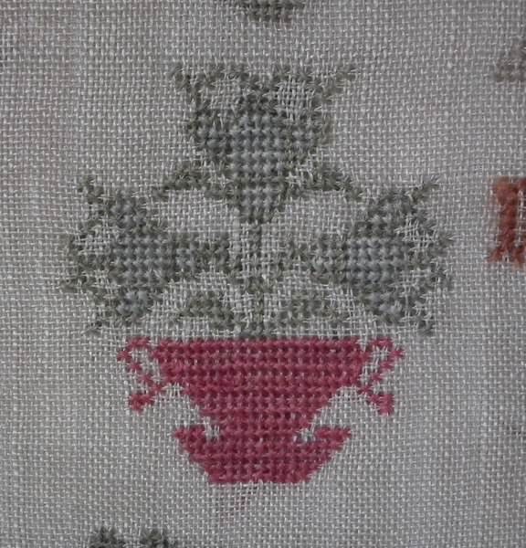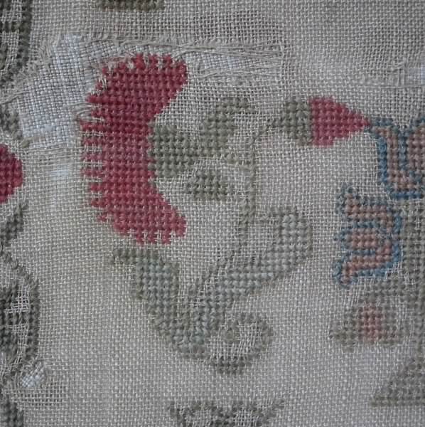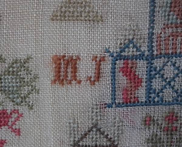 Colours red, green, light brown, copper, pink, orange, grey and blues. Family initials.