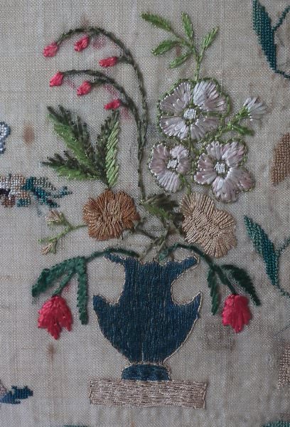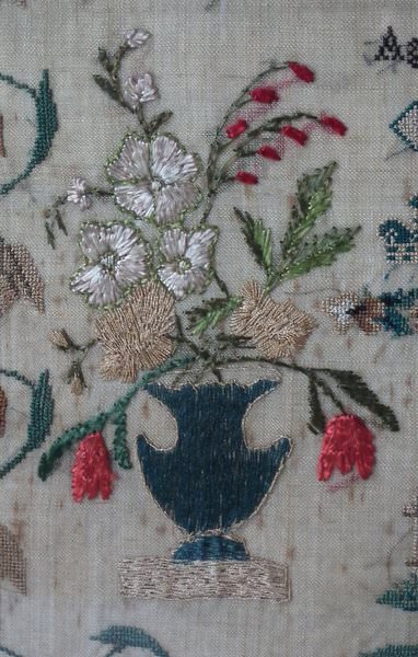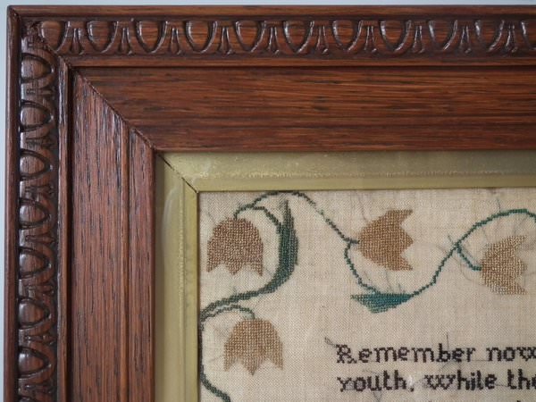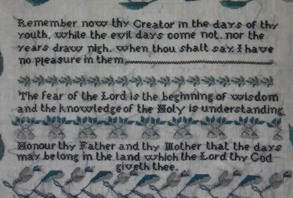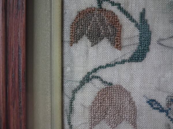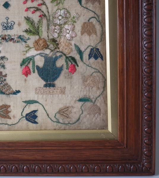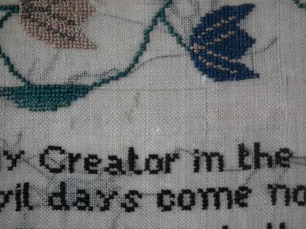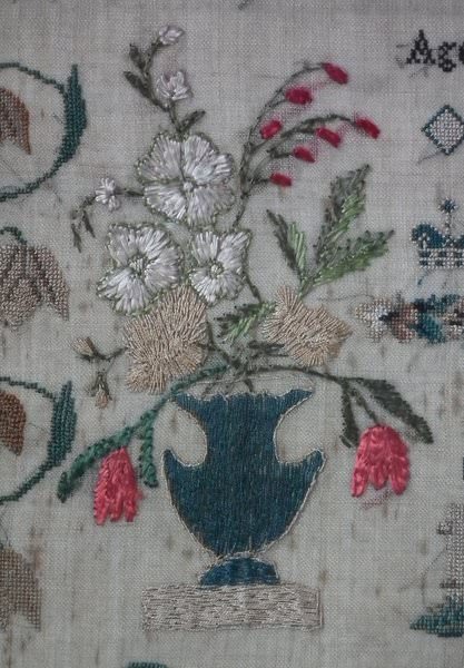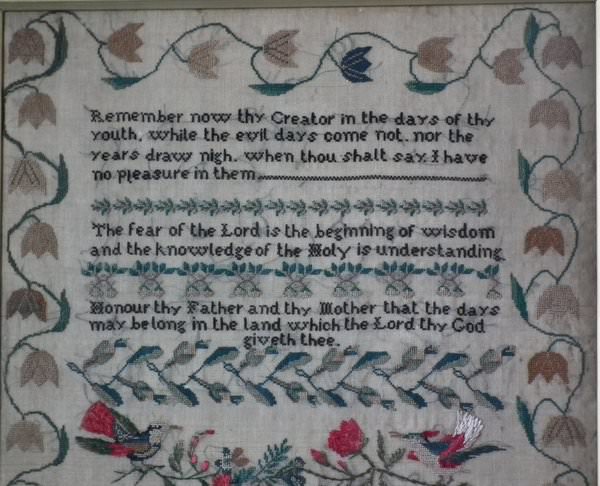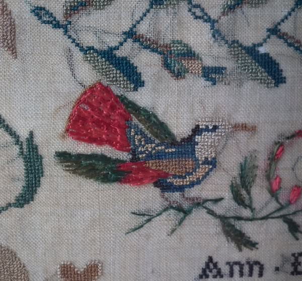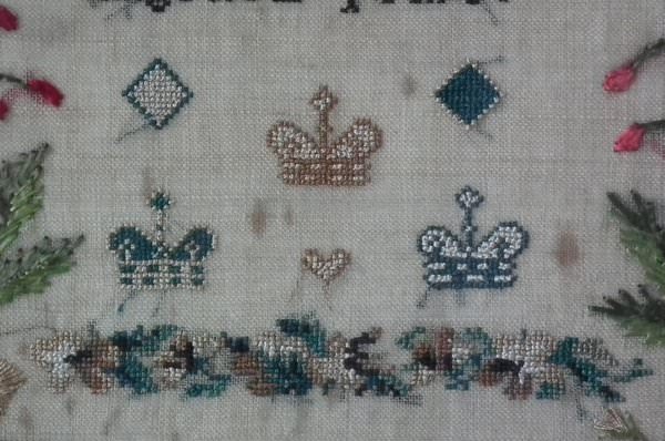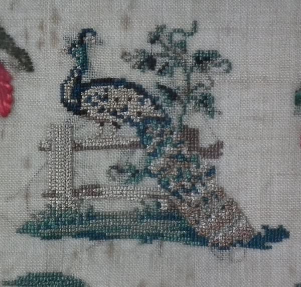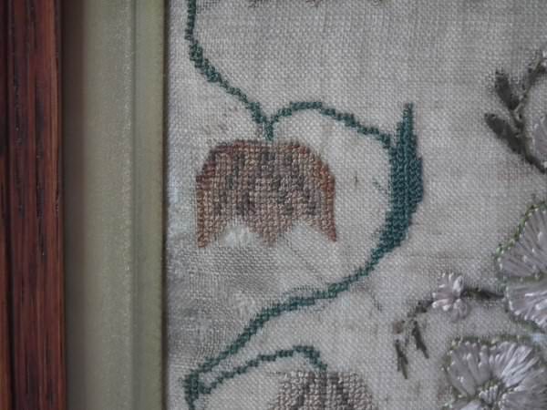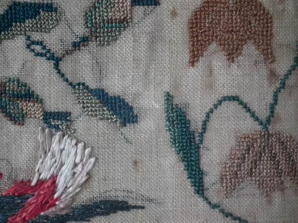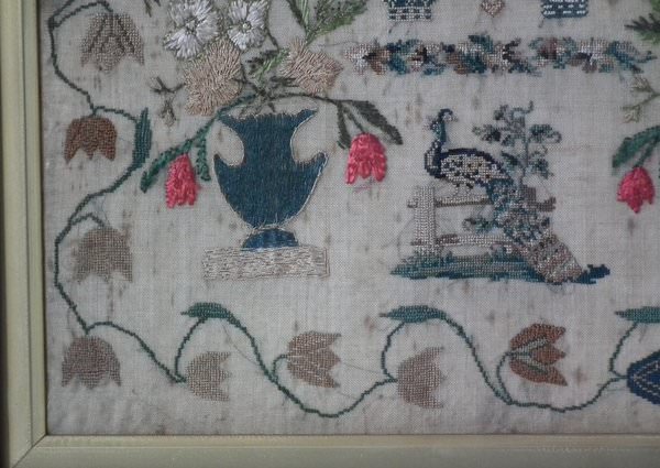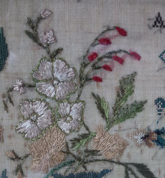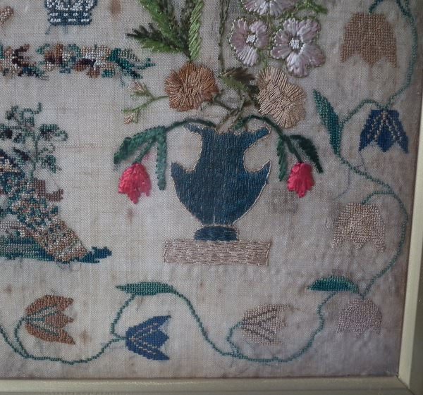 The sampler is worked in silk on linen ground, in a variety of stitches.