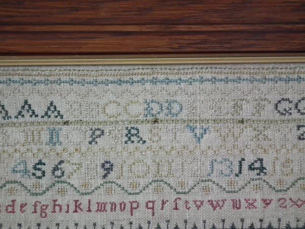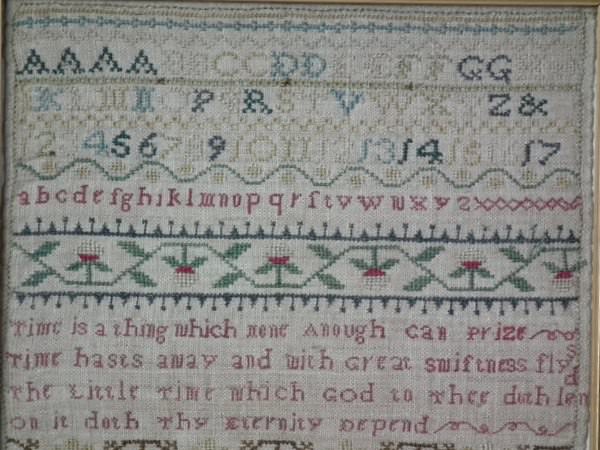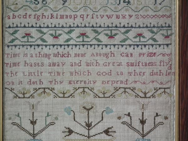 The sampler is worked in silk on linen ground, in a variety of stitches including Algerian eye.