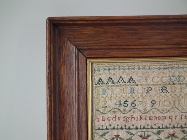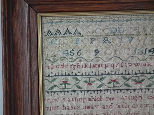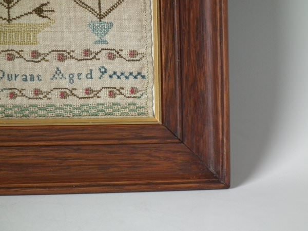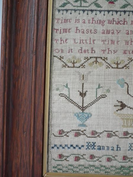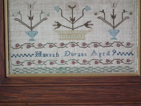 Circa 1800. 10.5ins by 7.25ins wide. Antique Sampler, circa 1835, by Hannah Durant. Framed in an old wood frame with glass.