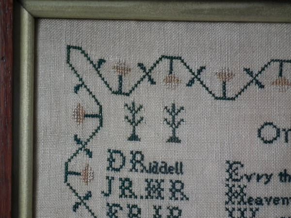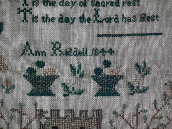 Victorian, dated 1844. 15.75 by 13.75ins wide. 1844 Sampler by Ann Riddell.