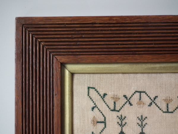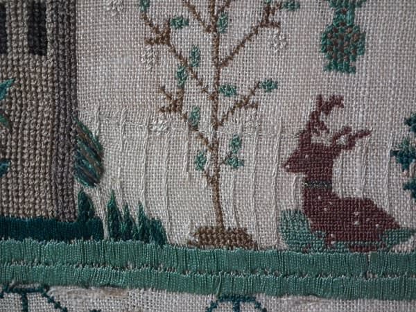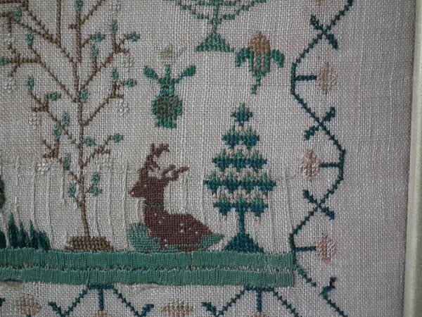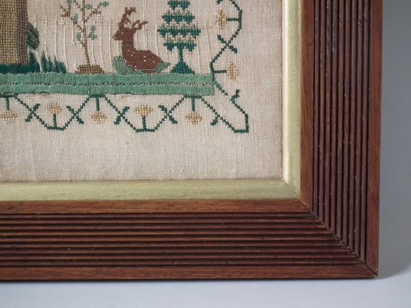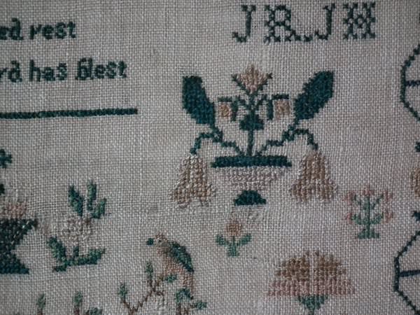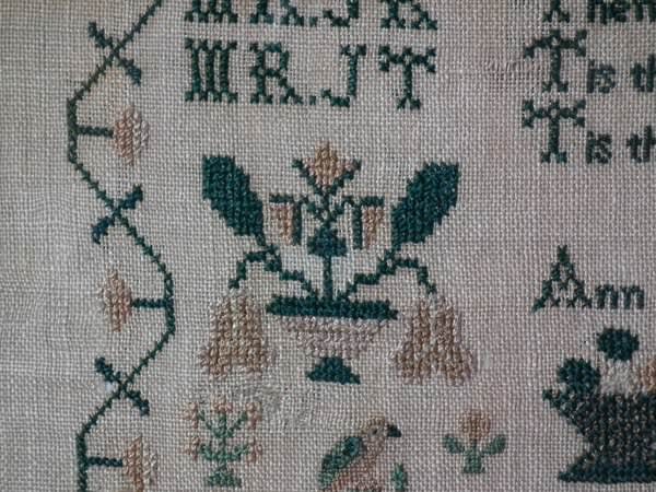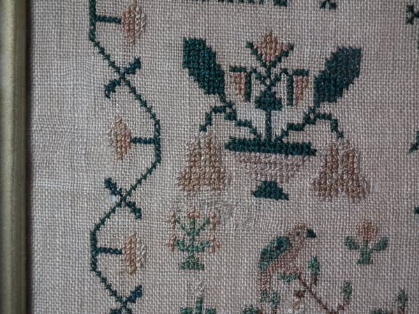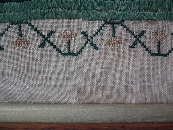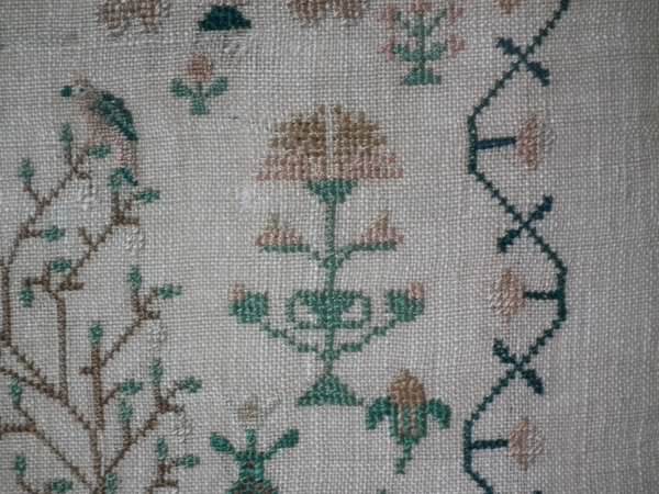 The sampler is worked in silk on linen ground, in a variety of stitches.
