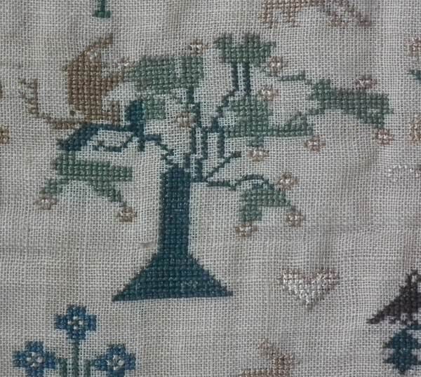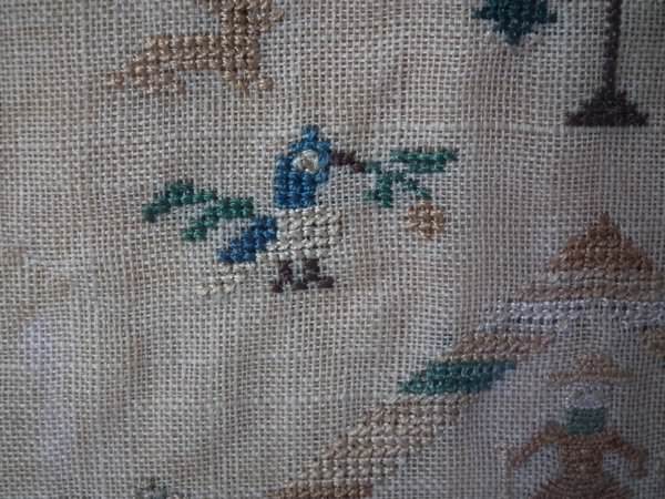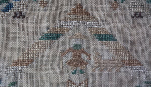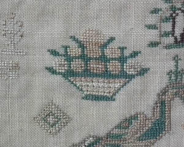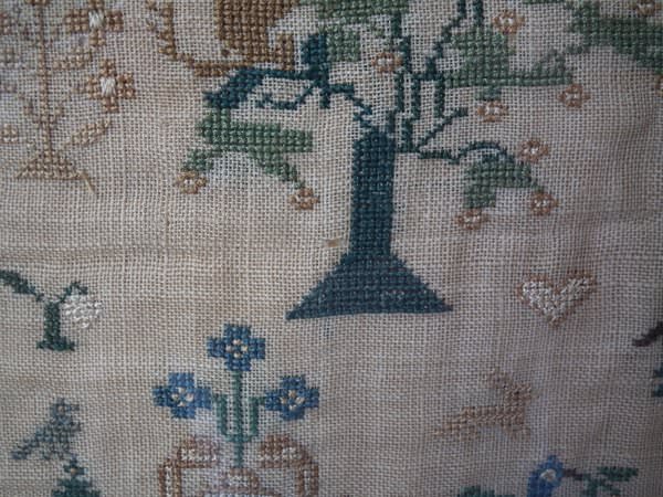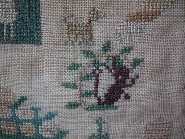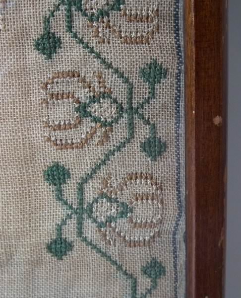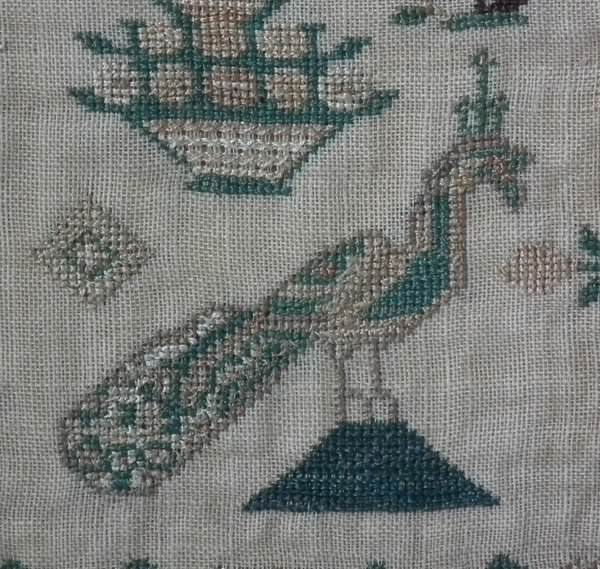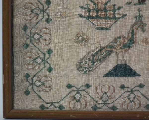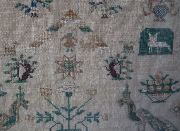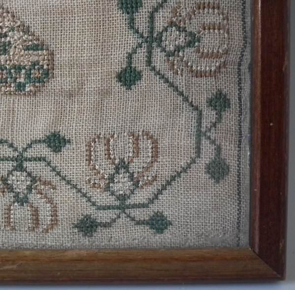 The sampler is worked in silk on linen ground, in a variety of stitches.