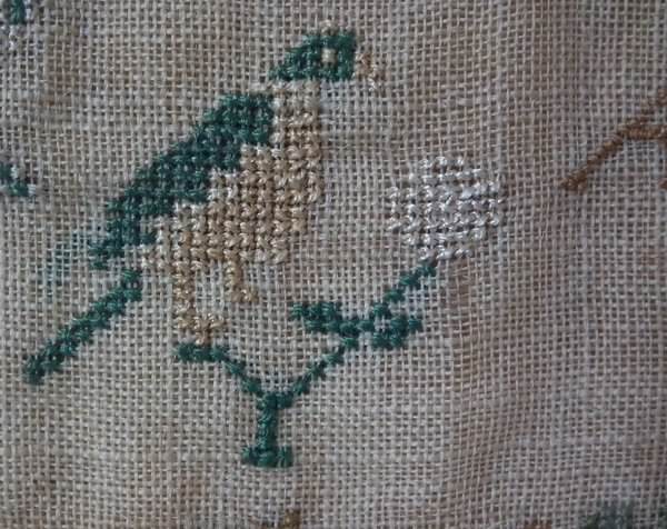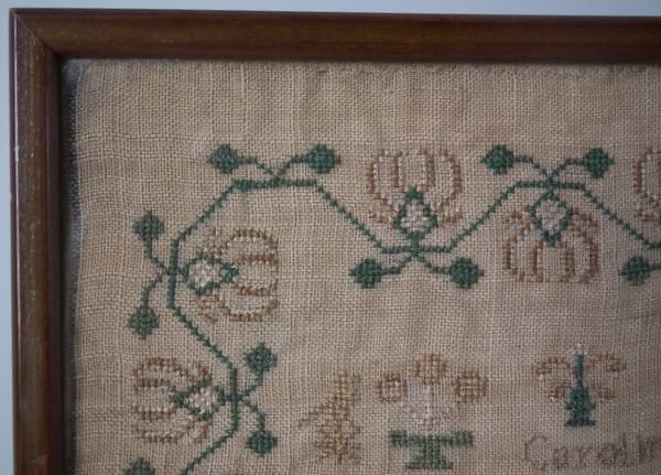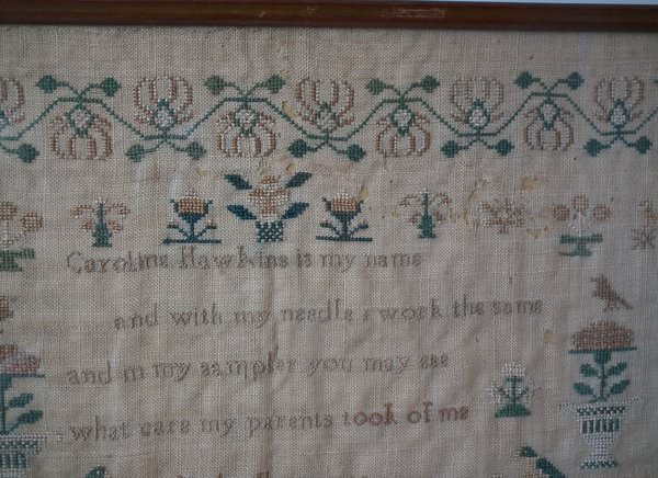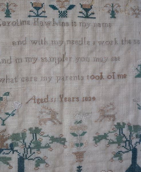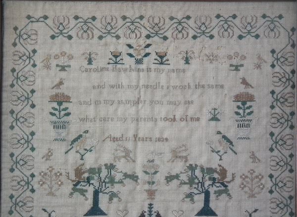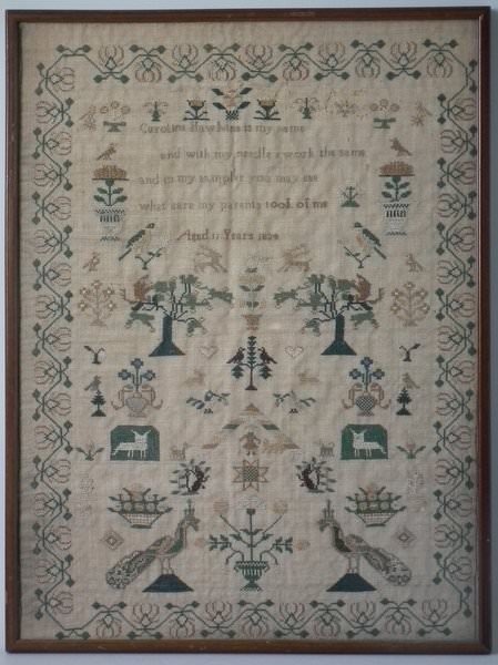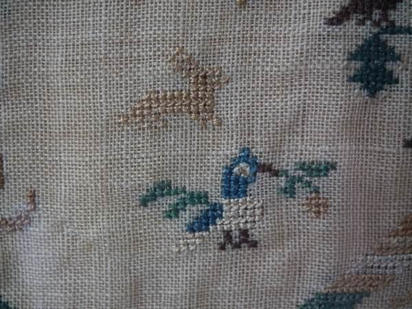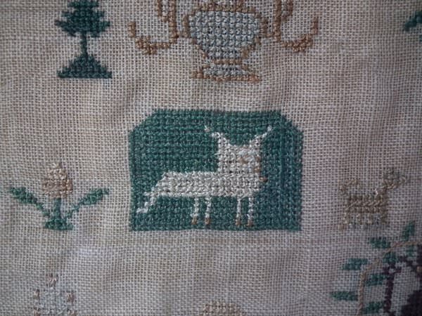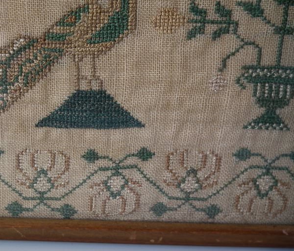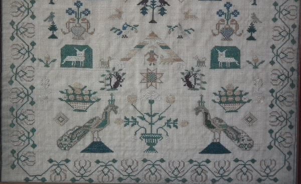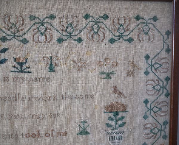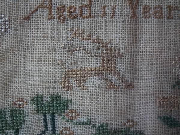 The sampler is worked in silk on linen ground, in a variety of stitches.
