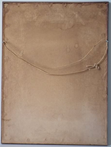Framed in a modern wood frame with glass. Fixed to chipboard backing.