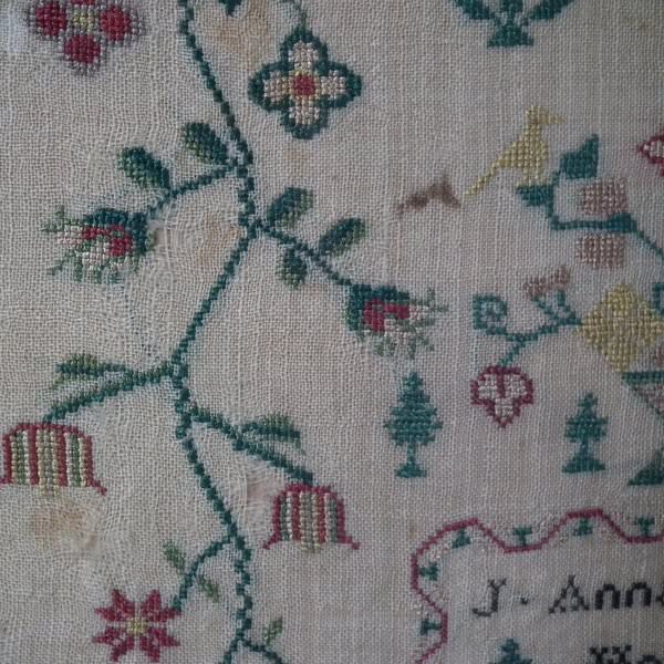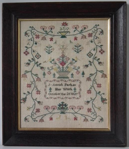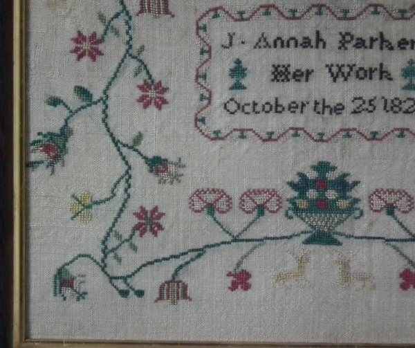 Colours greens, blue, white, black, red, peach and yellow. Signed and dated, 'J. Annah Parker Her Work October the 25 1827'.