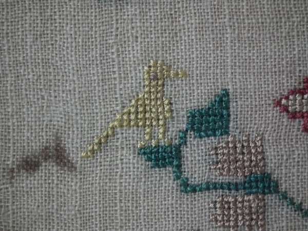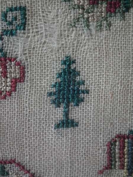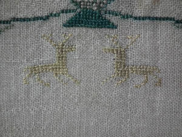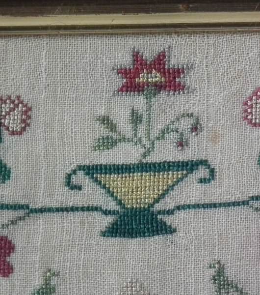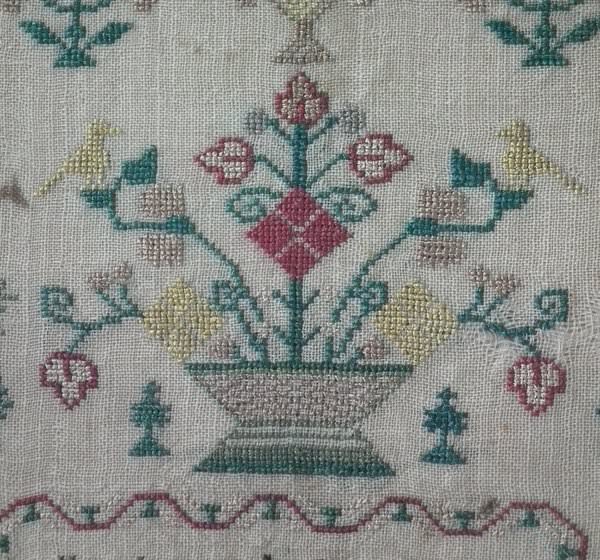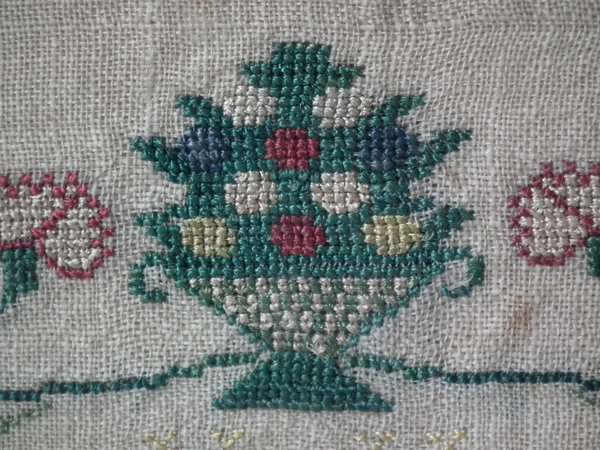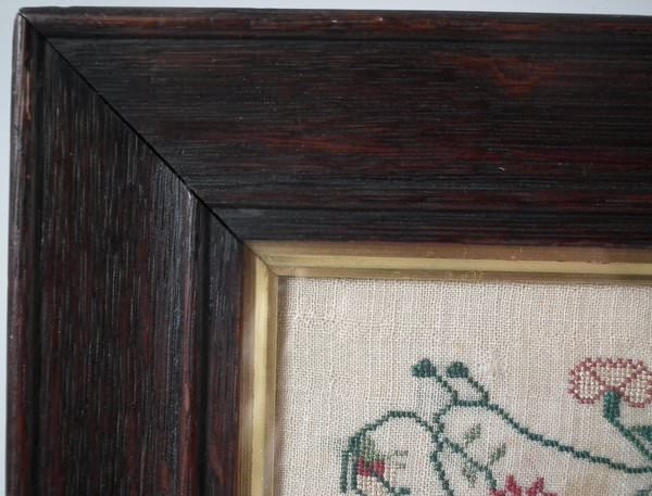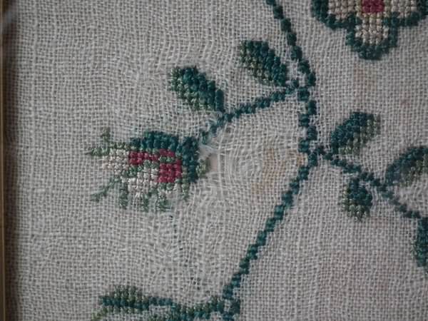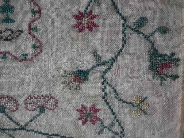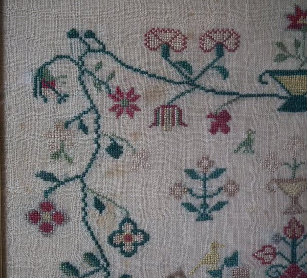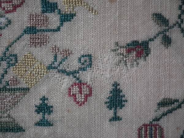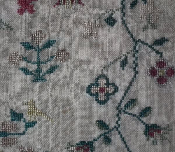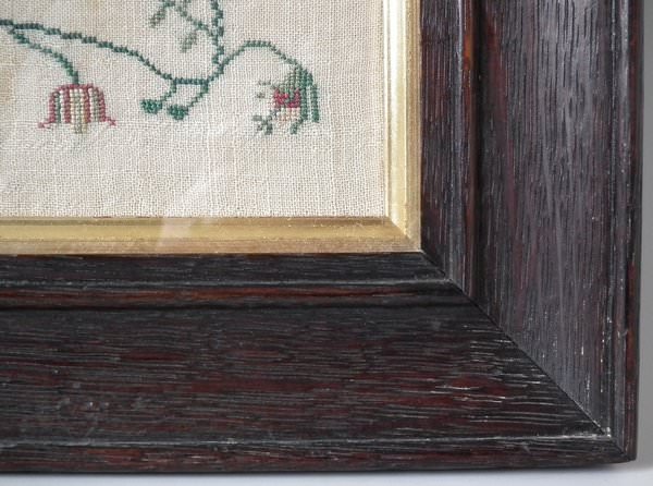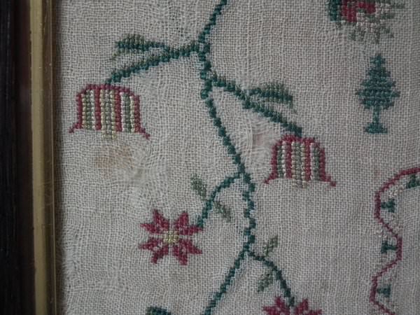 The sampler is worked in silk on linen ground, in a variety of stitches. Floral border.