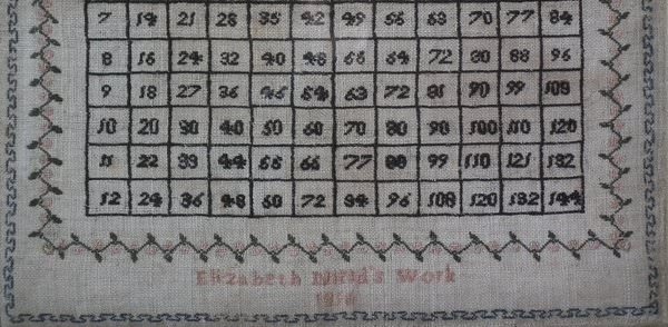 1816 Multiplication table sampler by Elizabeth Nields.