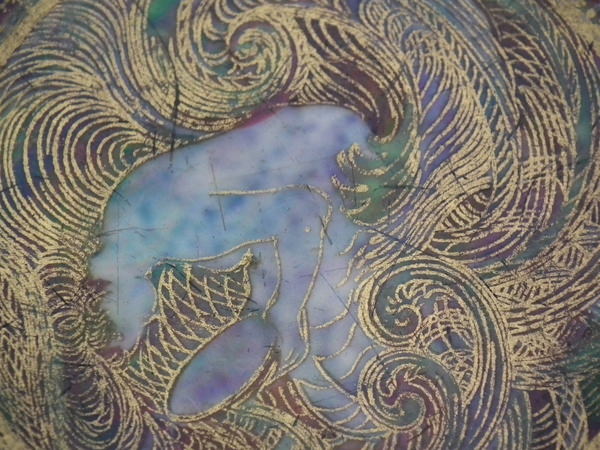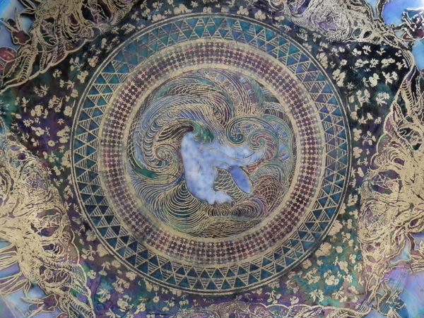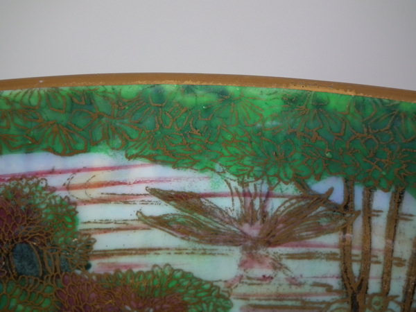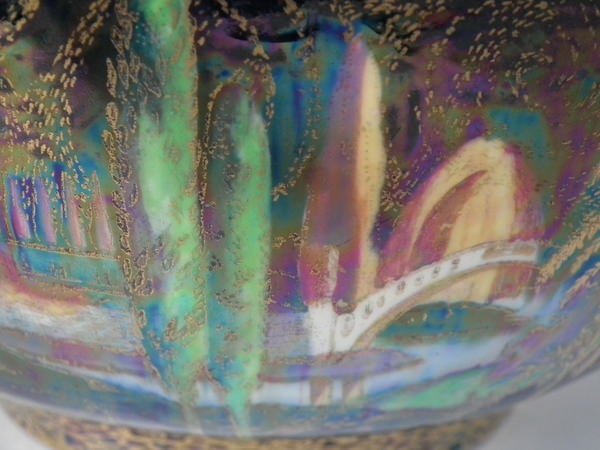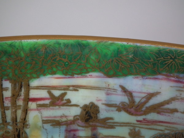 'Woodland Bridge' design on a mother of pearl ground to the interior. Cobble bead border to the foot rim.