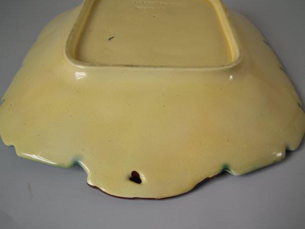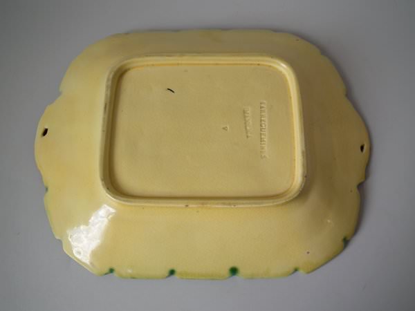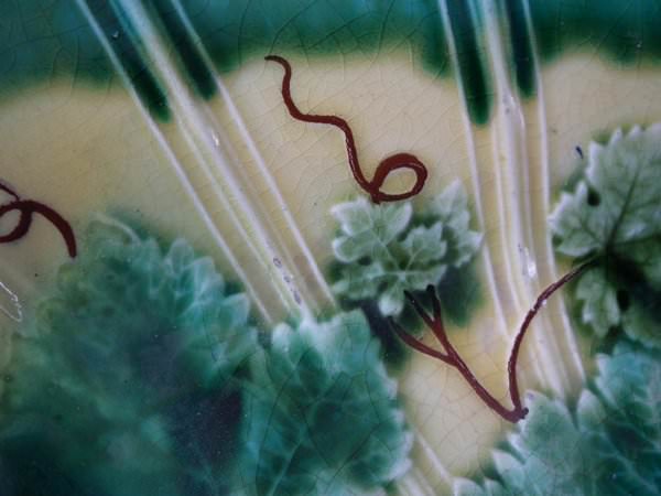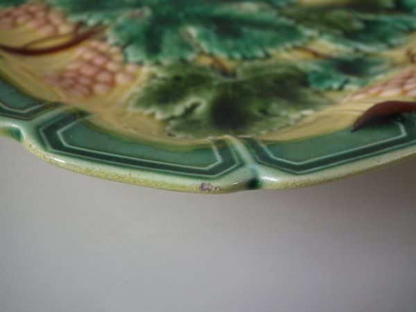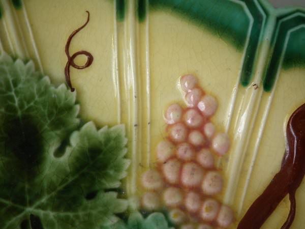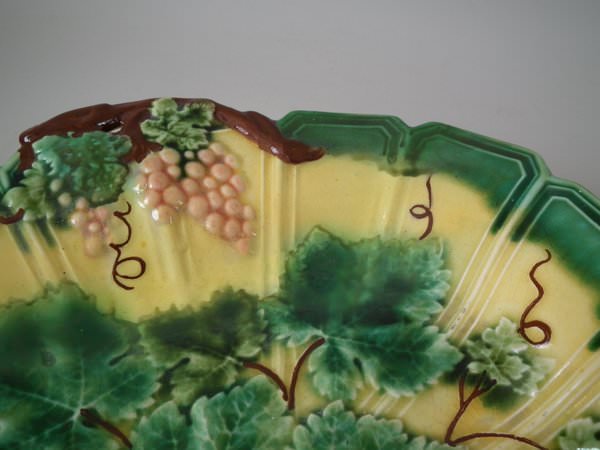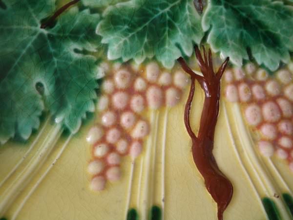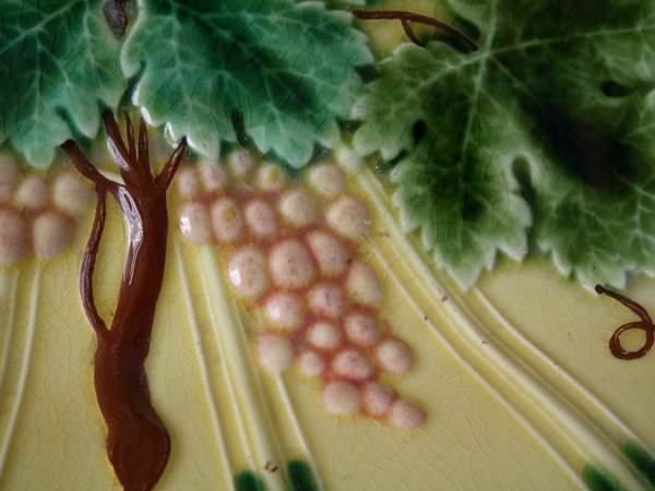 Victorian, circa 1880. 9.6ins high, 12.4ins wide, 1.9ins depth. Sarreguemines Majolica platter which features grapes and vines.
