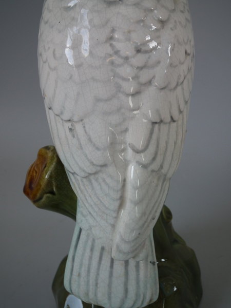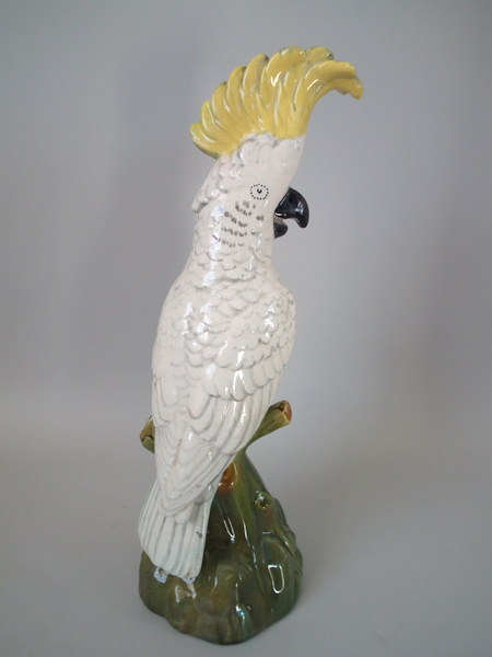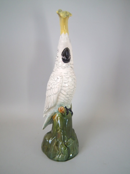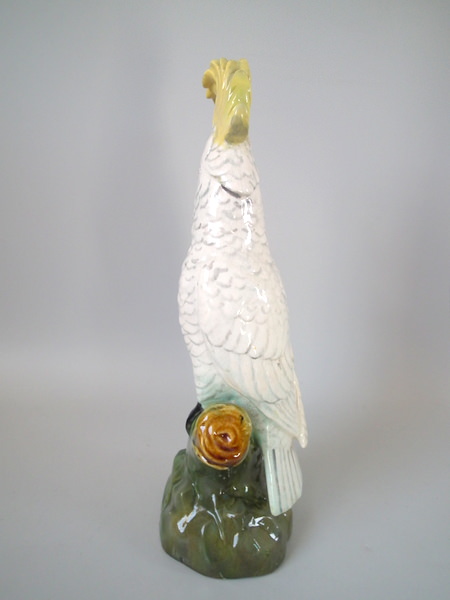 Edwardian, circa 1910. 5.3ins high, 4.7ins wide, 4.3ins depth. Mintons Majolica figural which features a cockatoo perched on a tree stump.