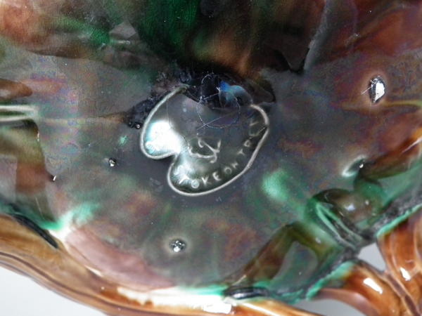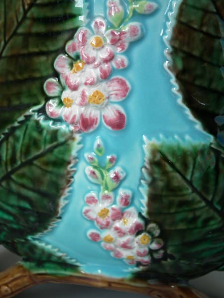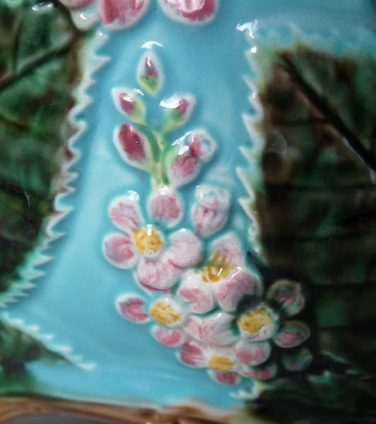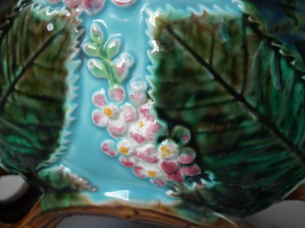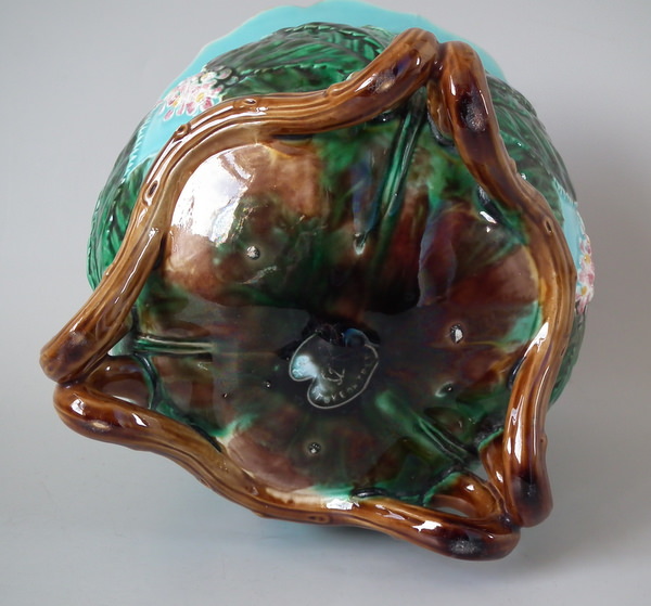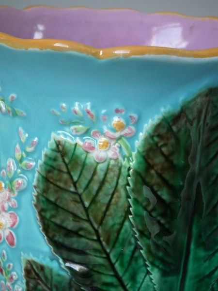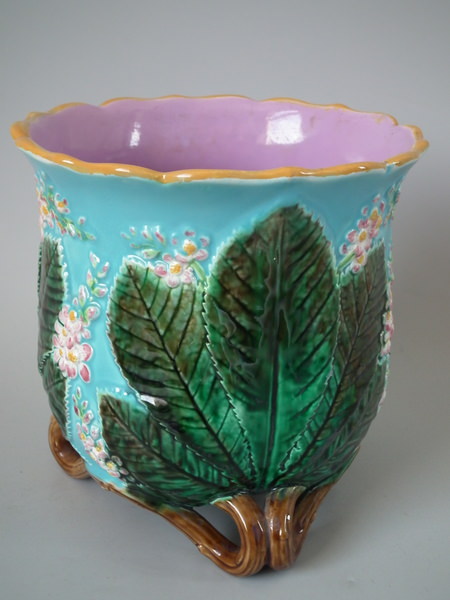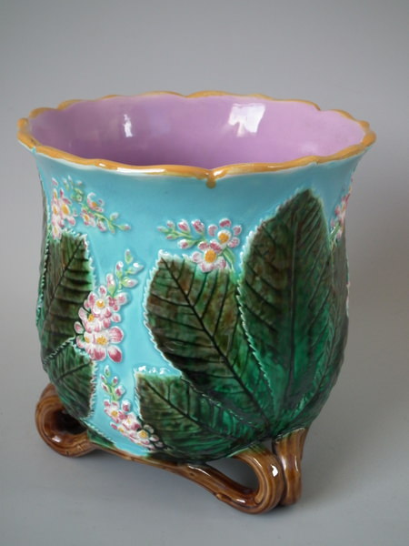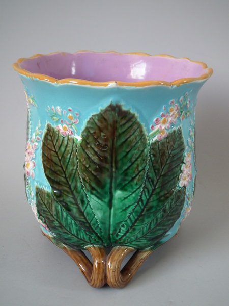 Victorian, circa 1870. 7.1ins high, 7.1ins wide, 7.1ins depth. George Jones Majolica jardinière which features horse chestnut flowers and leaves and branch feet. Turquoise ground version. Colouration: green, pink, ochre, are predominant.
