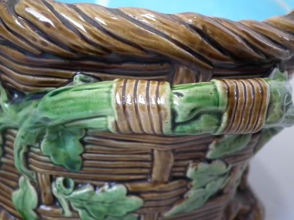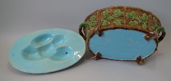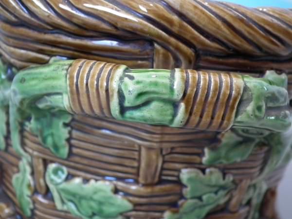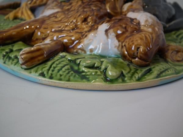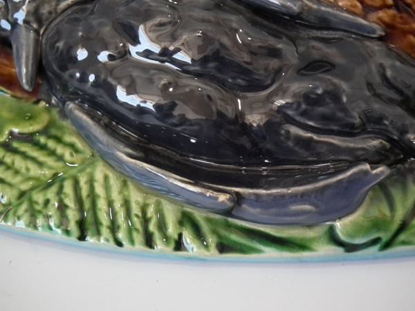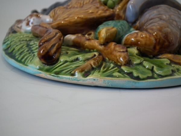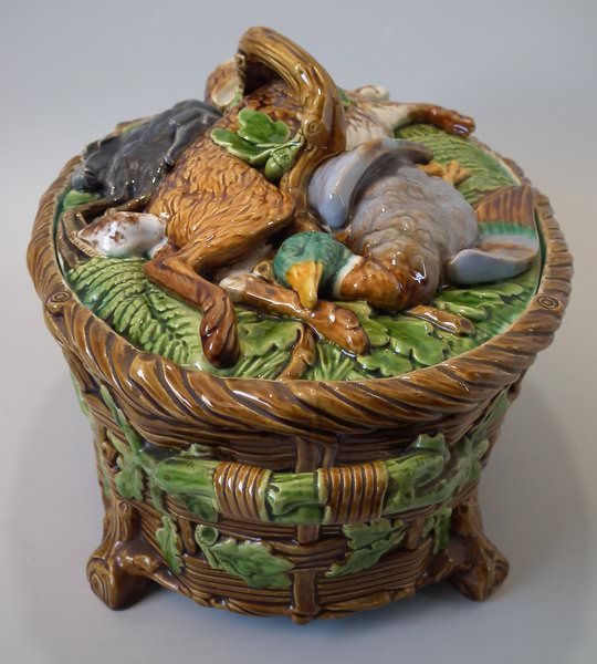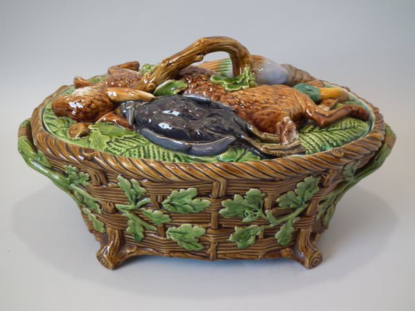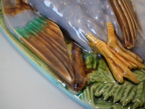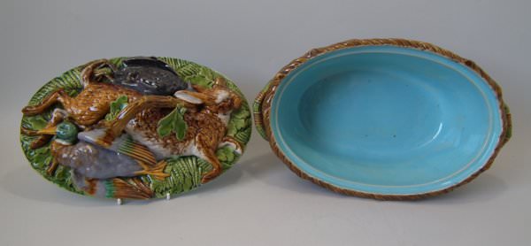 Minton Majolica game pie dish which features a hare, mallard and blackbird on a bed of fern and oak leaves.