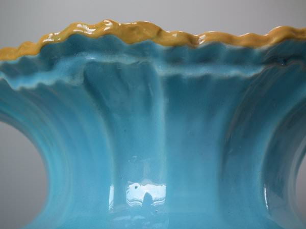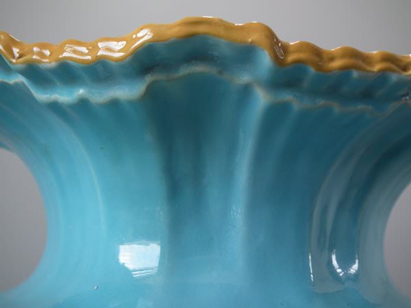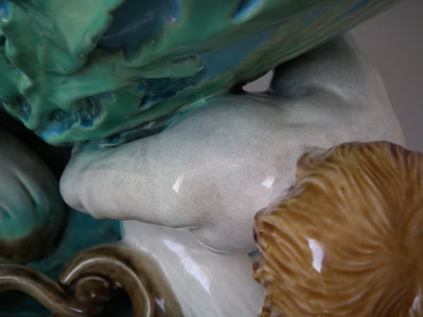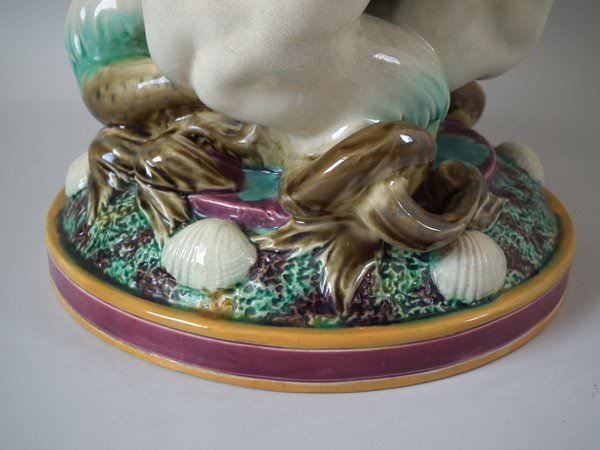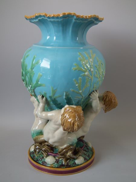 Minton Majolica vase which features 3 mermen supporting a shell vase.