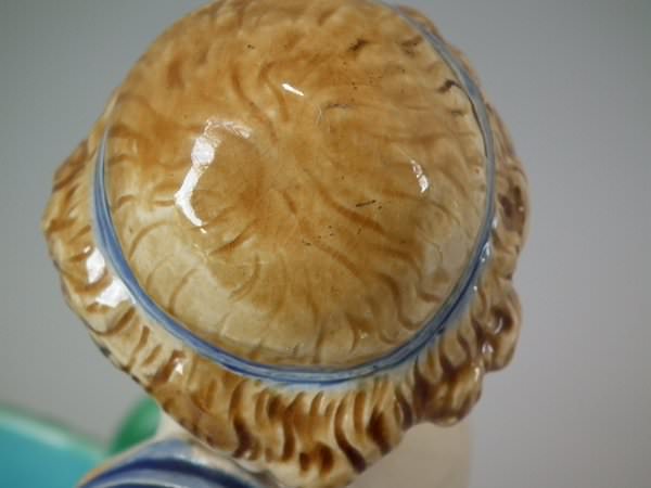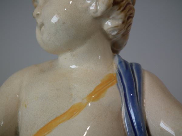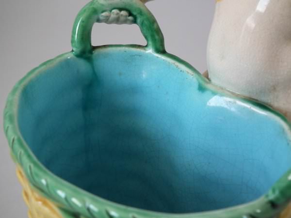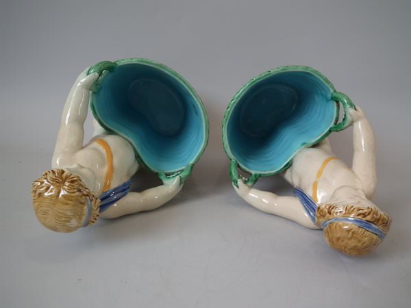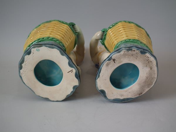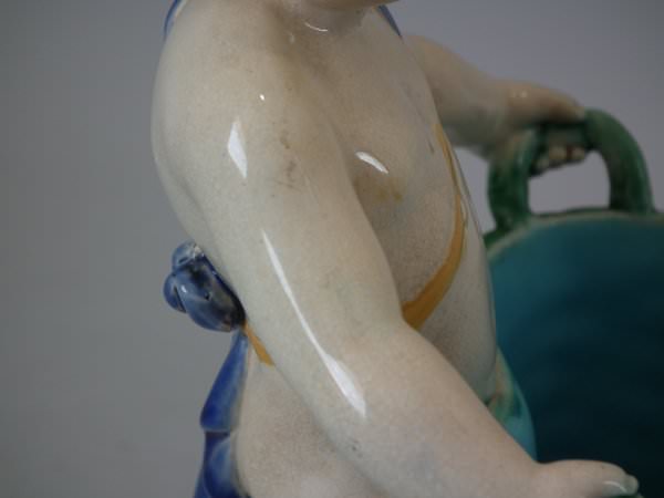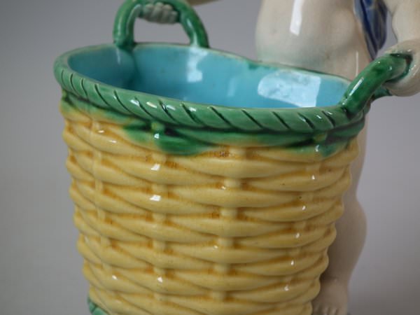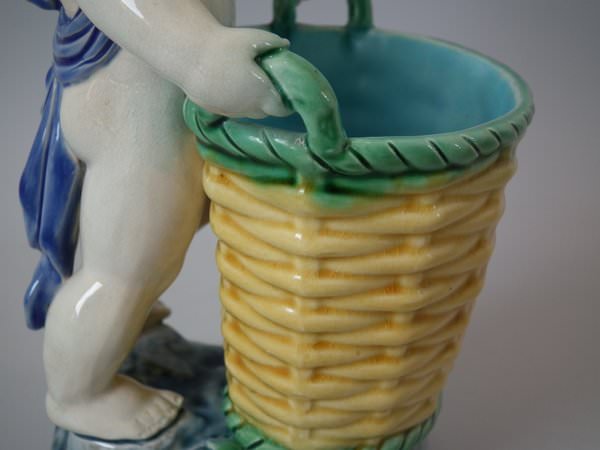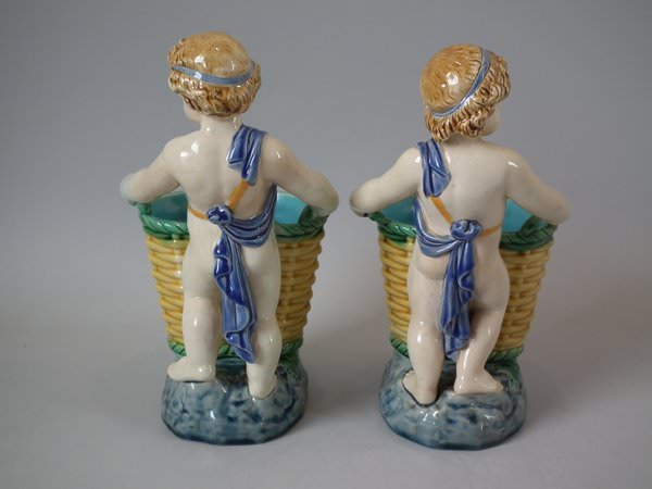 Pair of Minton Majolica figurals which feature a putti holding a basket.