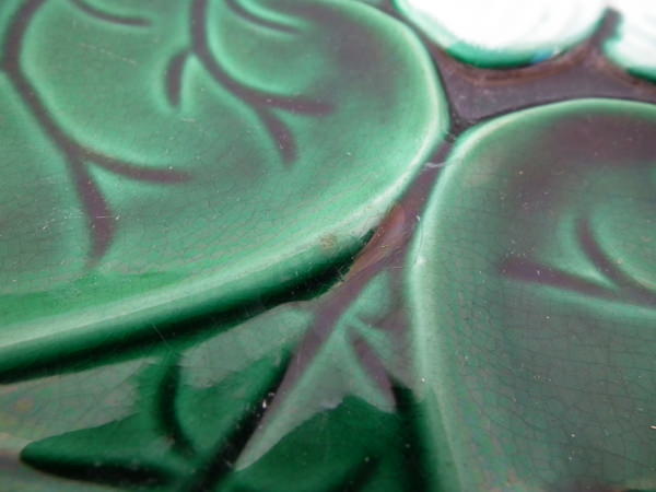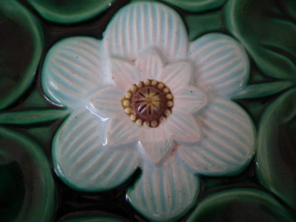 Victorian, circa 1870. 3.1ins high, 12.2ins wide, 12.2ins depth. Majolica bowl which features lily pad leaves around a central flower.