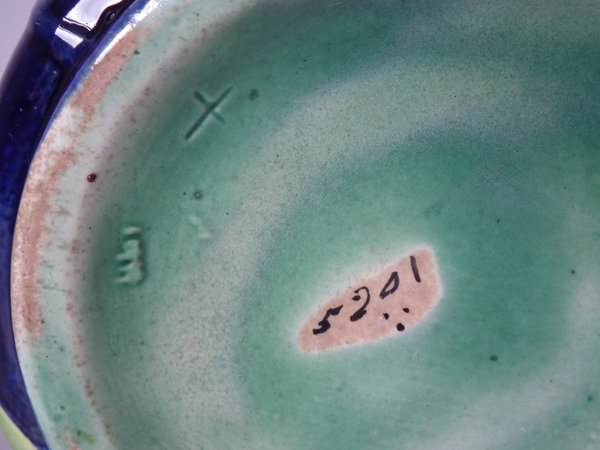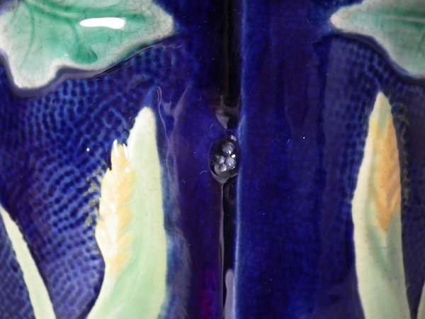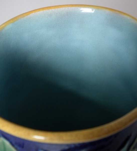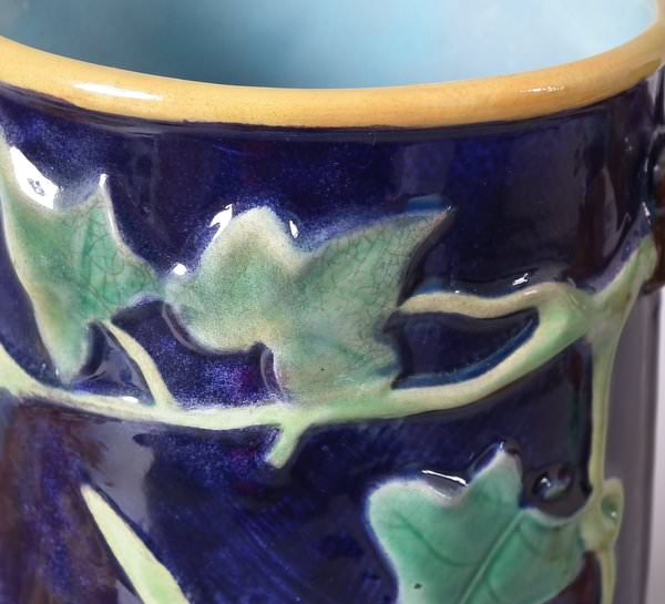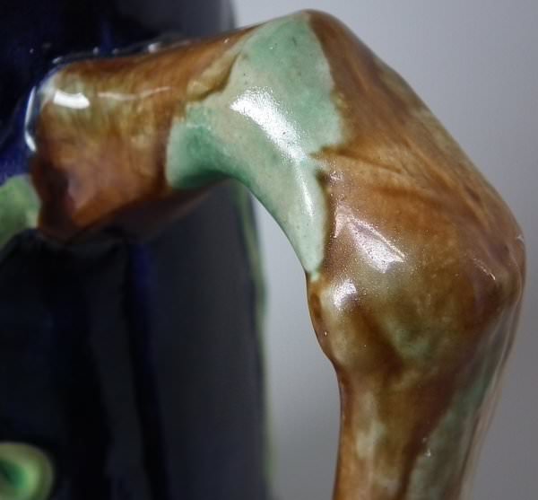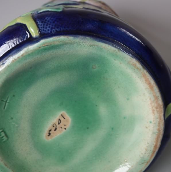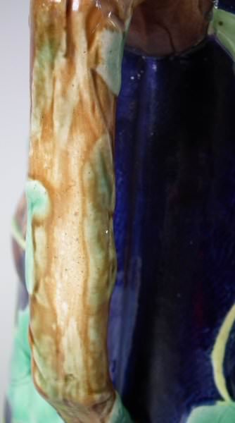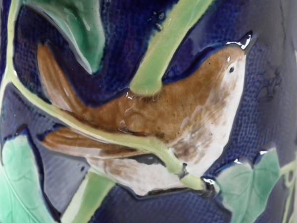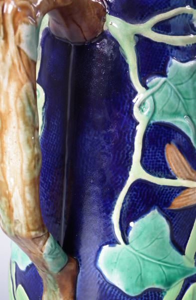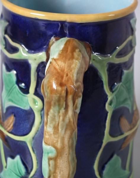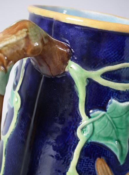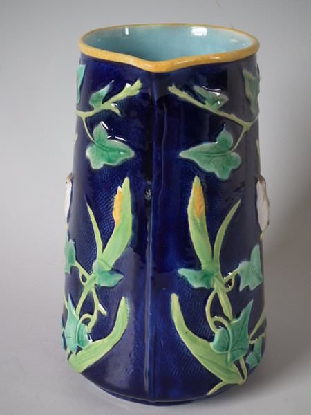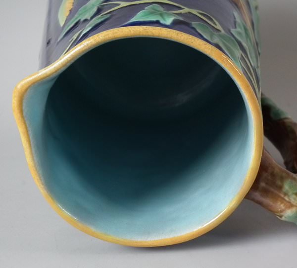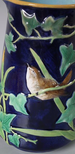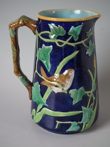 Victorian, circa 1870. 8ins high, 6.1ins wide, 5.1ins depth. George Jones Majolica jug/pitcher which features a bird (a wren) perched on some ivy. Colouration: cobalt blue, green, turquoise, are predominant.