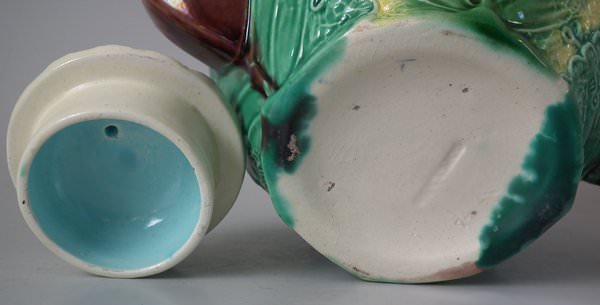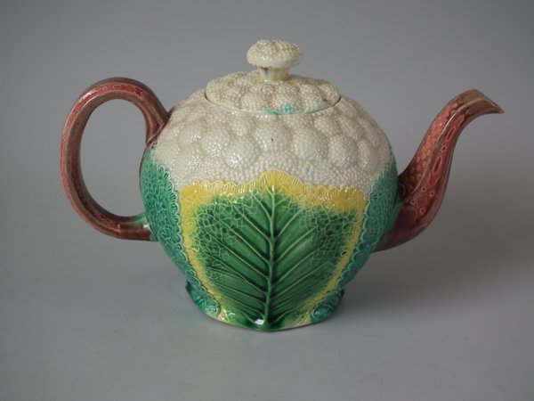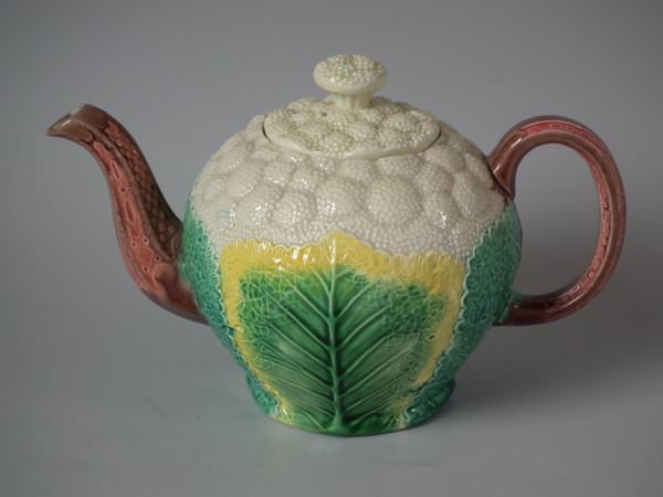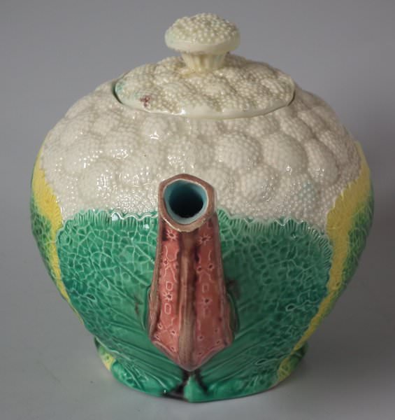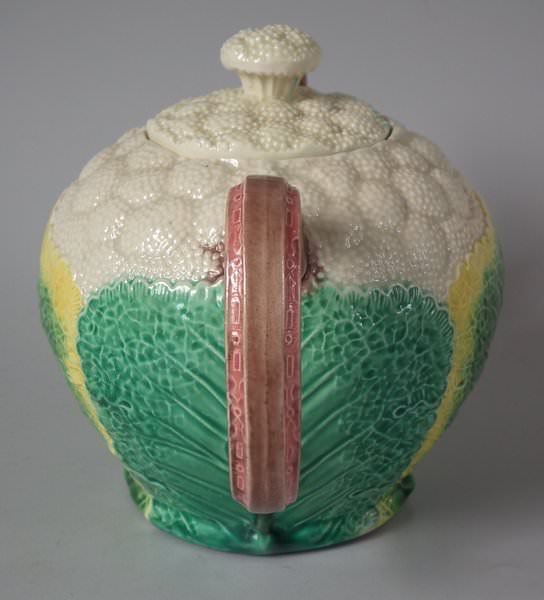 Victorian, circa 1870. 4.7ins high, 7.5ins wide, 4.7ins depth. Copeland Majolica teapot which features cauliflower leaves on a cauliflower textured ground.