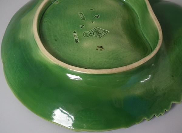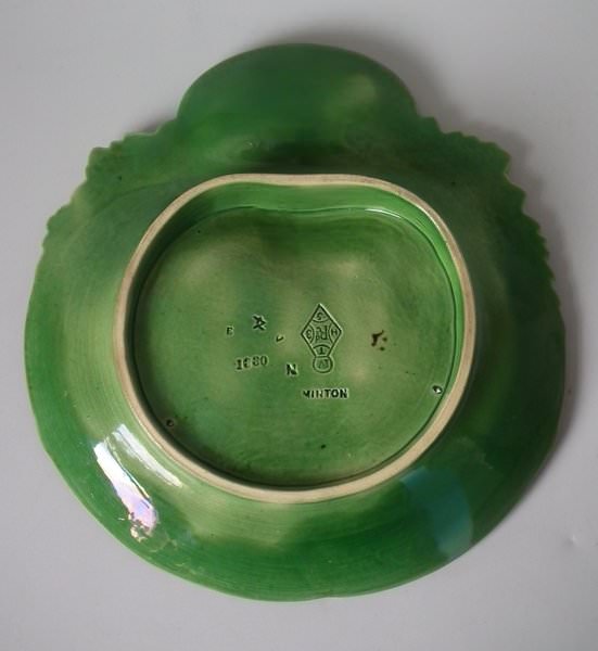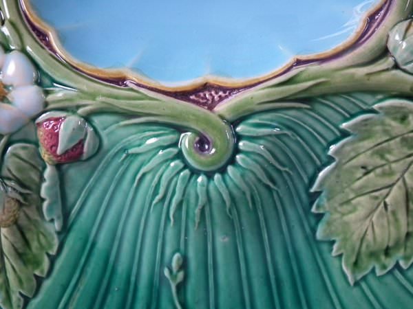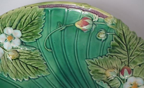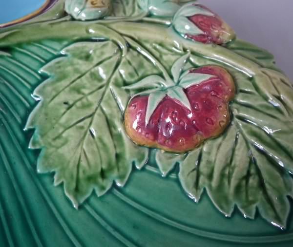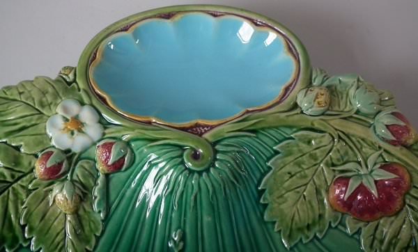 Victorian, circa 1867. 8.4ins high, 8.1ins wide, 1.3ins depth. Minton Majolica strawberry server which features features strawberry fruits, leaves and flowers. Green ground version. Colouration: green, turquoise, puce, are predominant.