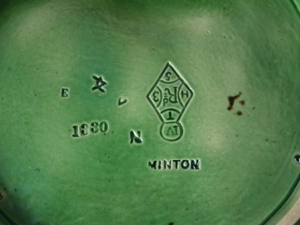 The piece bears maker's marks for the Minton pottery. Bears a pattern number, '1330'. English diamond registration mark for the date 03/04/1867. Marks include a factory specific date cipher for the year 1867.